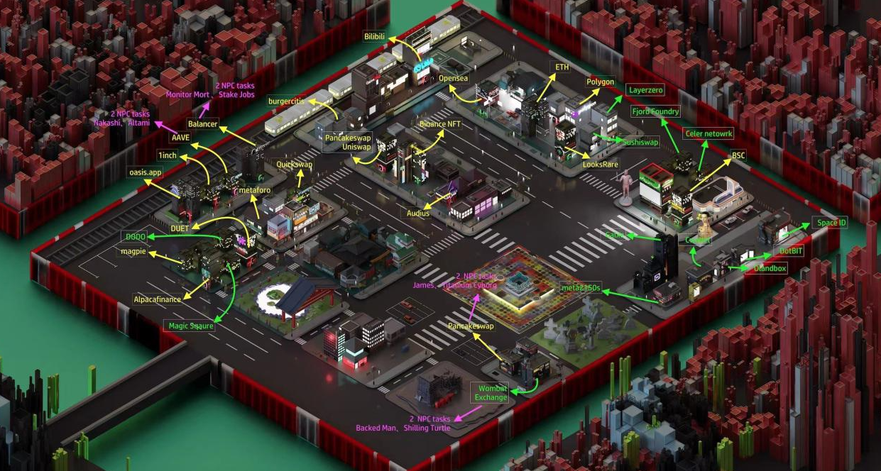 Вконце прикреплю карту где расположены здания с названиями проектов для ариентирования.Подбегаете каждые 15 мин к зданию и лутаете баксы и т.д