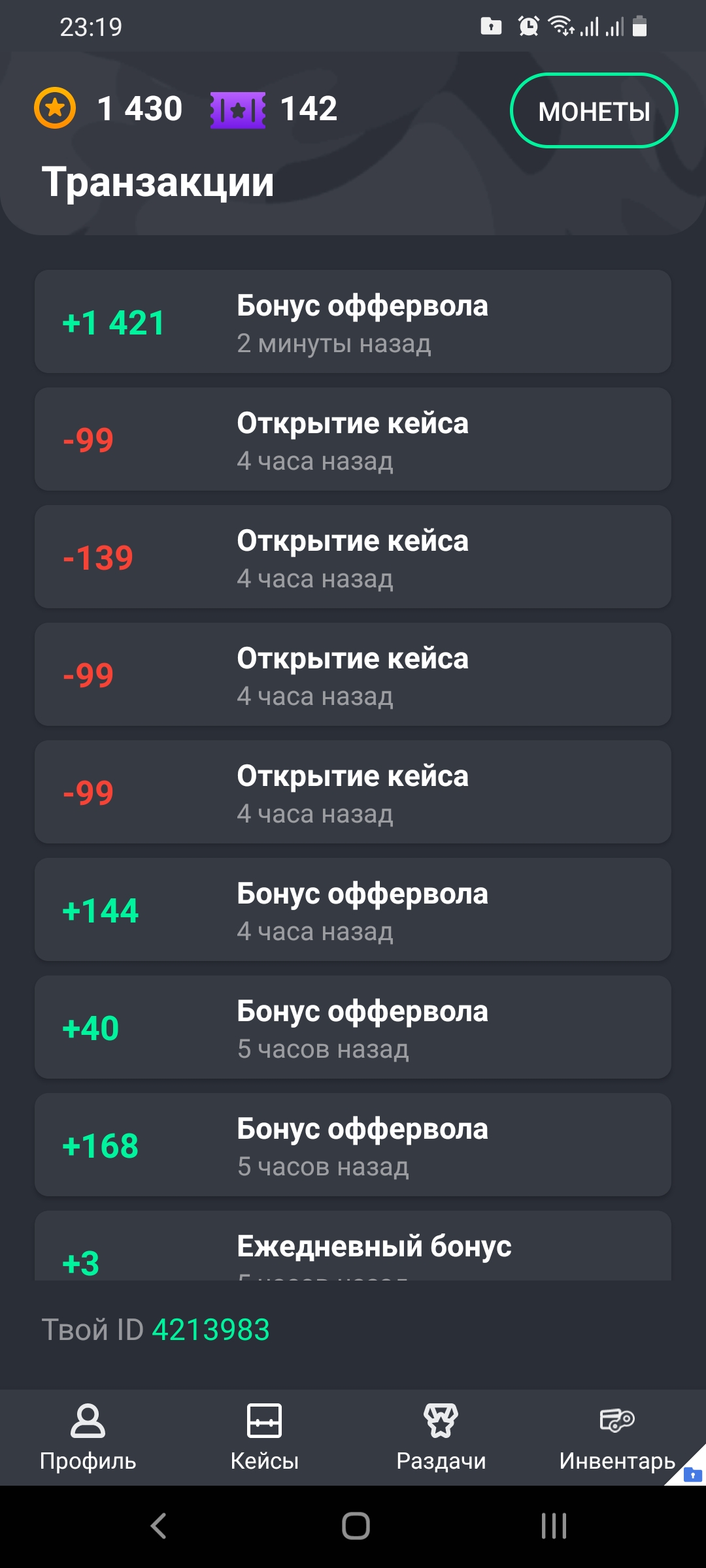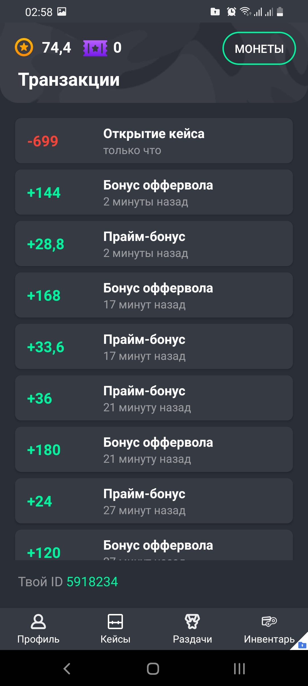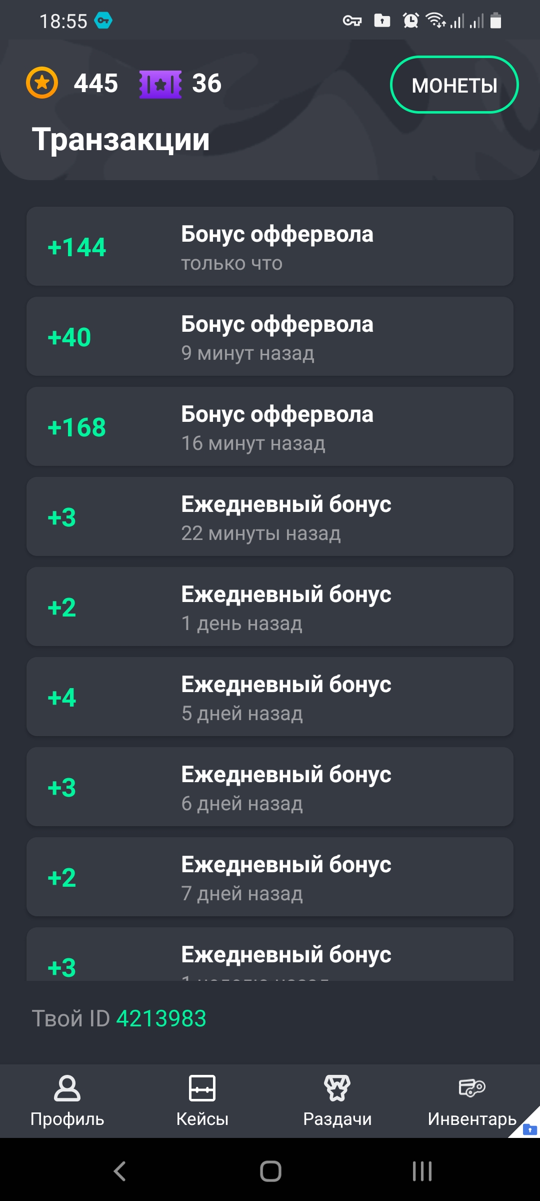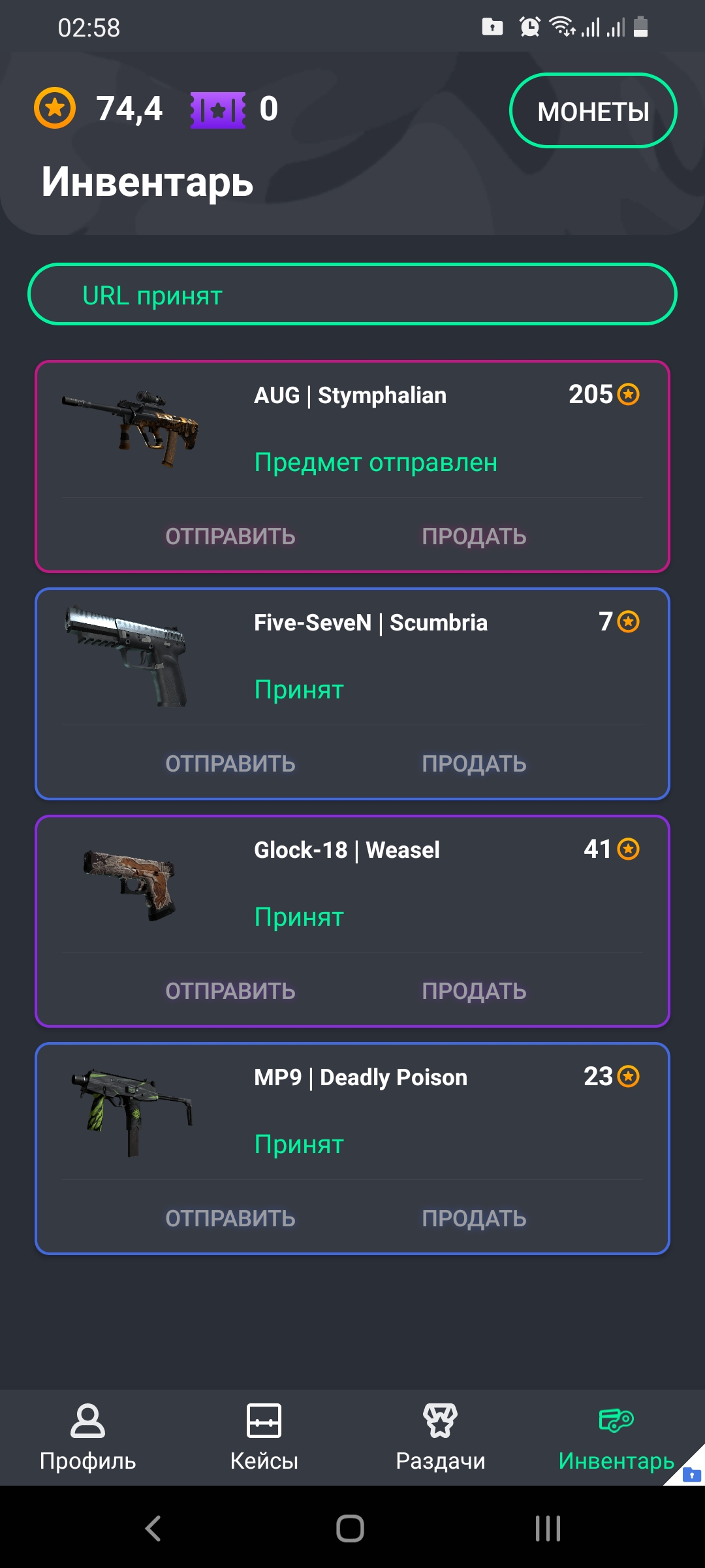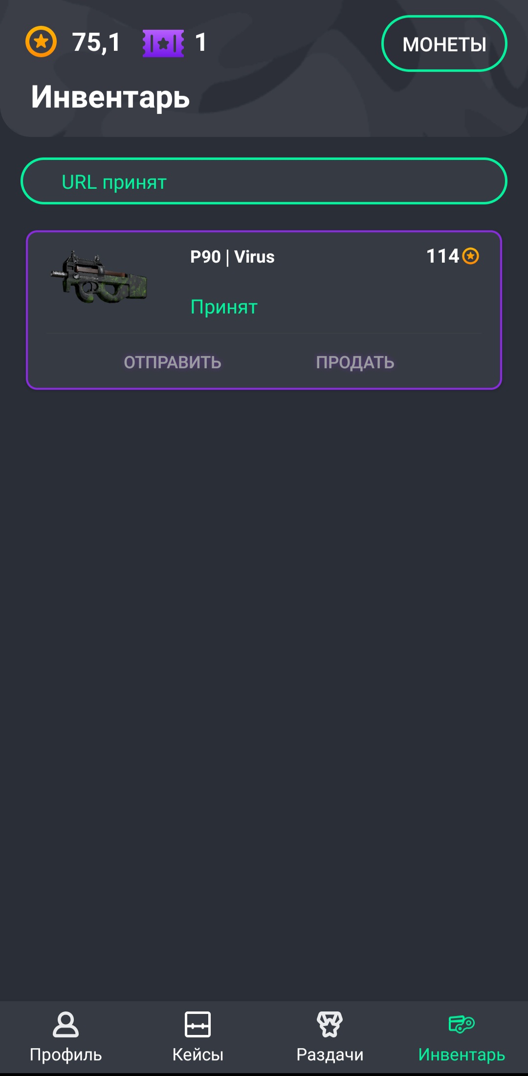 БЕСПЛАТНЫЕ СКИНЫ CSGO Сап, есть одна тема, качаем приложение GoCaseshttps://play.google.com/store/apps/details?id=com.gocases. Вводим промокод J89eRLN9 на 20 монет (не бойтесь, я за вас вообще нихуя не получу, я так самого себя рефал, это нихуя не дает, если зотите поищите другие коды, все по 20 дают), так же у вас будет еще один бесплатный кейс, на 25+ монет, итого имеем уже на старте 50~ монет. Кликаем каждый день на забрать бонус, забираем от 1 до 5 монет. Для регистрации нужна gmail почта, для скинов нужен любой STEAM аккаунт на котором включен SteamGuard (защита включена). Т.е. даже не надо закидывать 5$ для разблокировки торговой площадки, главное чтобы обмен работал и всё. Чуете чем пахнет? Это все можно абузить, уже как пару месяцев оттуда вывожу стабильно скины, никто не мешает тебе сделать по 20-30 gmail, и столько же аккаунтов STEAM. После получения переводим на свой главный аккаунт (перед этим ждём 7 дней). Самый дешевый кейс стоит 69 монет, там скины 8-15 рублей стоят, но можно пооткрывать кейсы подороже, за 109 монет. Мне выпадали шмотки и по 100 рублей (p90 virus, usp-s cyrex и т.д пруфы на них ниже, потому что только 4 картинки помещается). Так же можно выполнять задания за монеты, сам выполнял парочку, но это нелегко, так можно выполнить по типу установить ТикТок и т.д., пару сотен точно заработал таким образом. В день уходит минут по 5 на сбор всех монет со всех аккаунтов. Сами аккаунты (что стим, что гугл почты, регаются тоже быстро, в день удаваллсь по 7-8 штук делать аккаунтов).