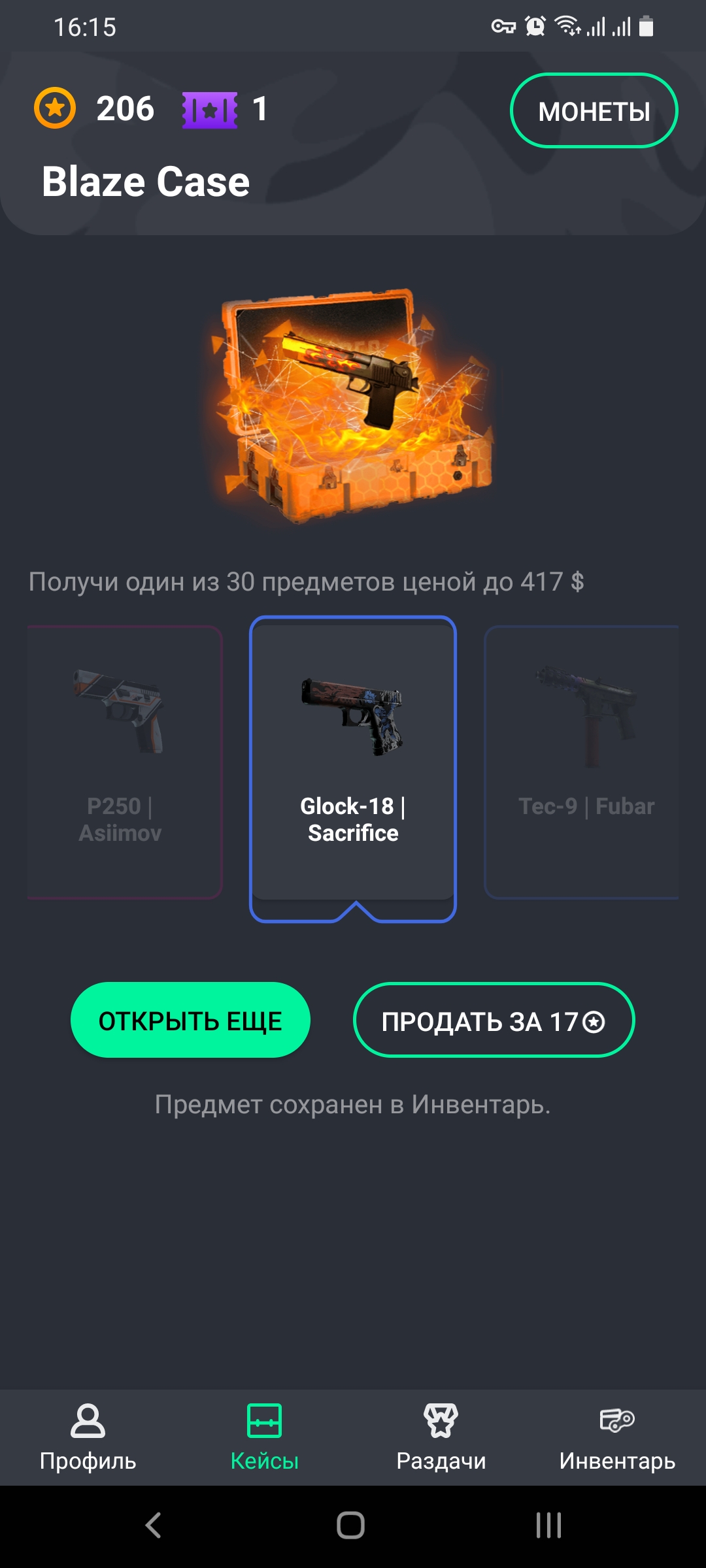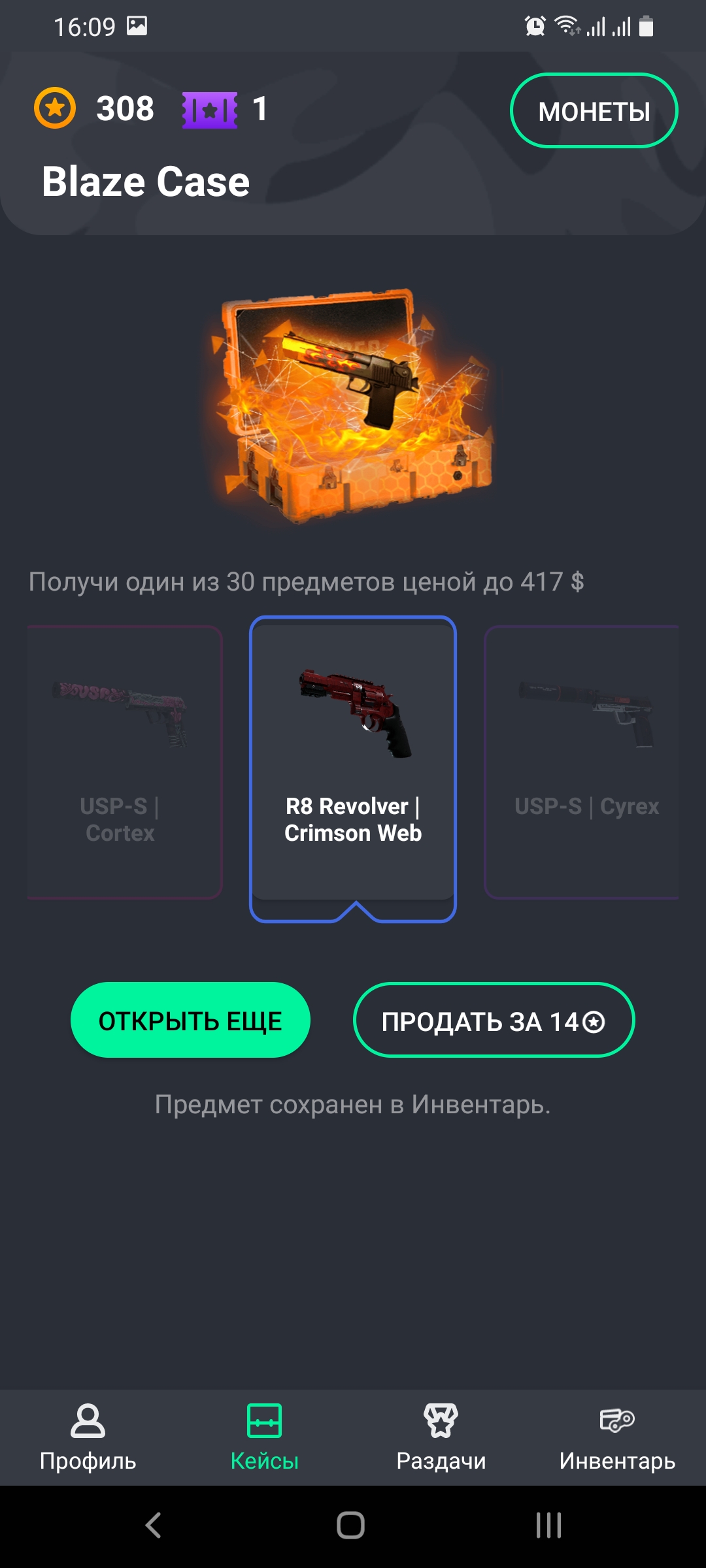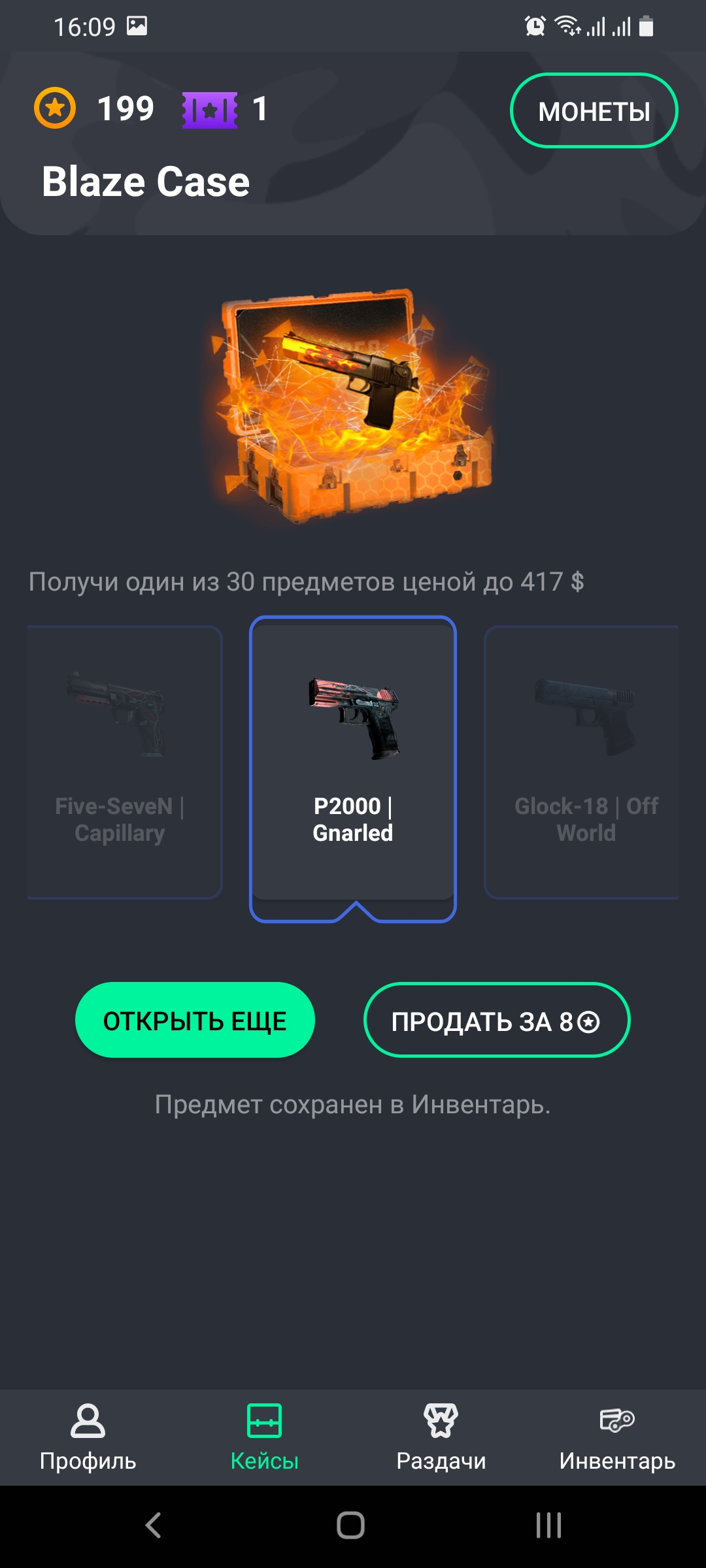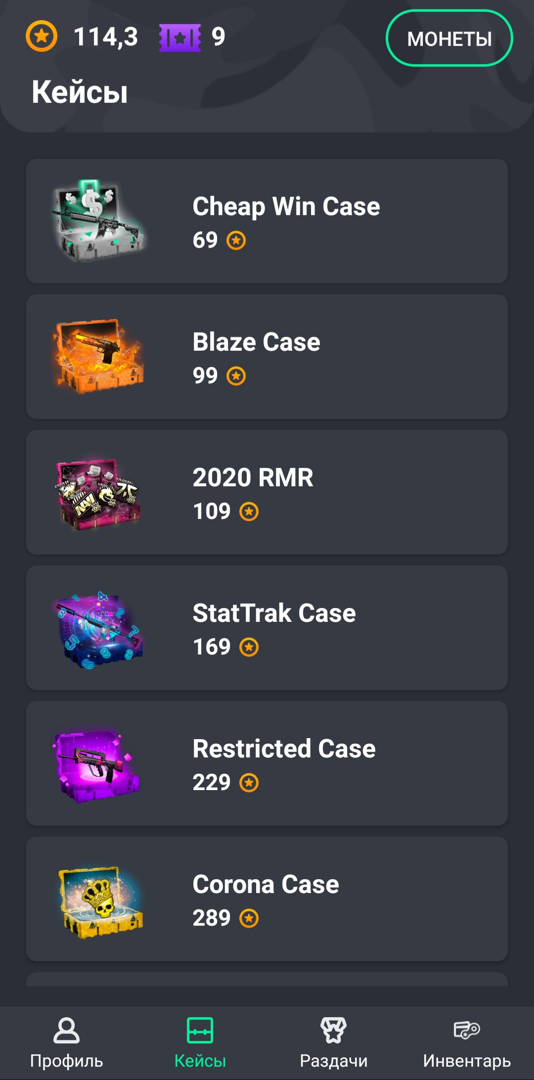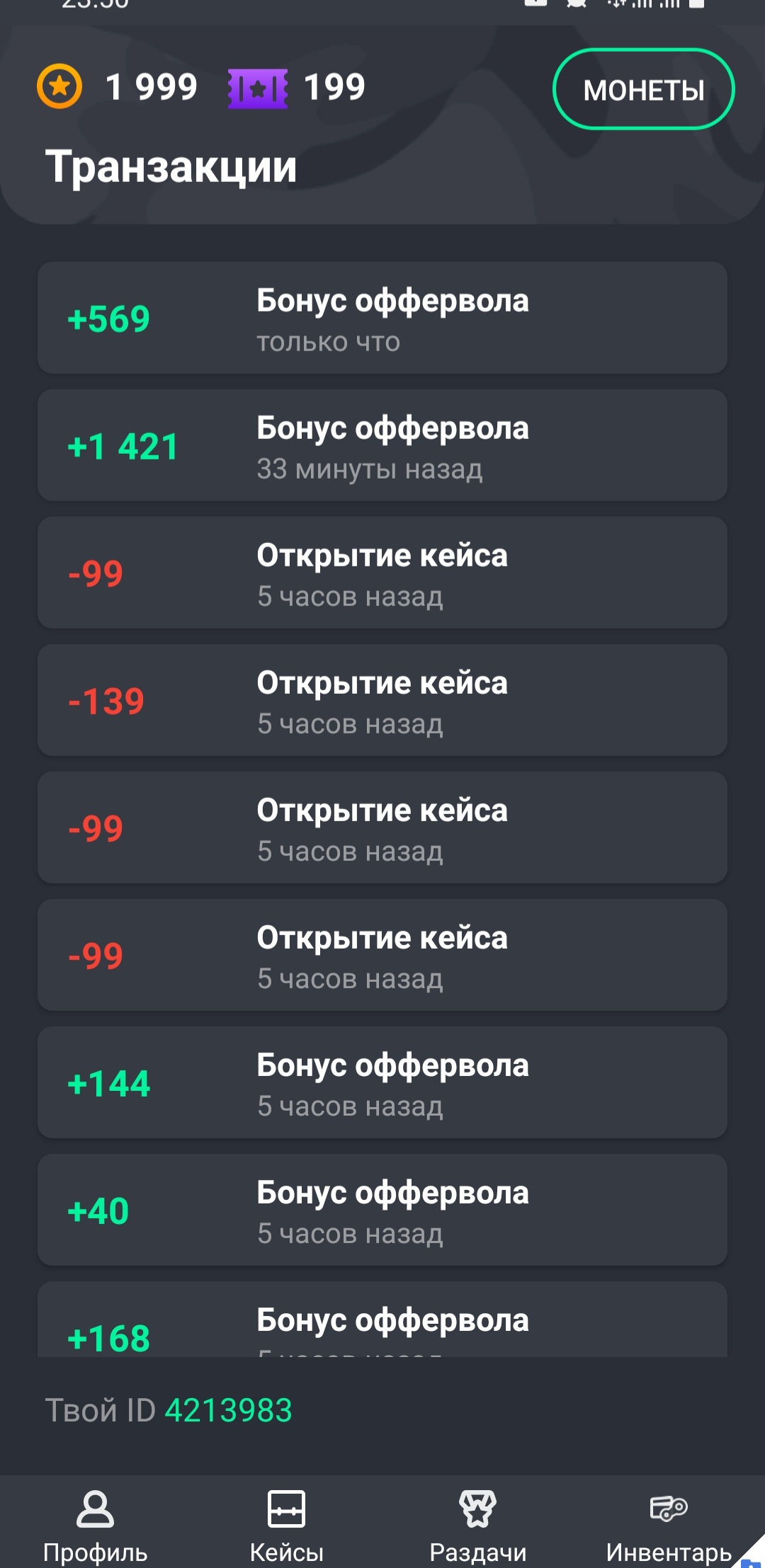 БЕСПЛАТНЫЕ СКИНЫ CSGO Сап, есть одна тема, качаем приложение GoCaseshttps://play.google.com/store/apps/details?id=com.gocases. Вводим промокод J89eRLN9 на 20 монет (не бойтесь, я за вас вообще нихуя не получу, я так самого себя рефал, это нихуя не дает, если зотите поищите другие коды, все по 20 дают), так же у вас будет еще один бесплатный кейс, на 25+ монет, итого имеем уже на старте 50~ монет. Кликаем каждый день на забрать бонус, забираем от 1 до 5 монет. Для регистрации нужна gmail почта, для скинов нужен любой STEAM аккаунт на котором включен SteamGuard (защита включена). Т.е. даже не надо закидывать 5$ для разблокировки торговой площадки, главное чтобы обмен работал и всё. Чуете чем пахнет? Это все можно абузить, уже как пару месяцев оттуда вывожу стабильно скины, никто не мешает тебе сделать по 20-30 gmail, и столько же аккаунтов STEAM. После получения переводим на свой главный аккаунт (перед этим ждём 7 дней). Самый дешевый кейс стоит 69 монет, там скины 8-15 рублей стоят, но можно пооткрывать кейсы подороже, за 109 монет. Мне выпадали шмотки и по 100 рублей (p90 virus, usp-s cyrex и т.д пруфы на них ниже, потому что только 4 картинки помещается). Так же можно выполнять задания за монеты, сам выполнял парочку, но это нелегко, так можно выполнить по типу установить ТикТок и т.д., пару сотен точно заработал таким образом. В день уходит минут по 5 на сбор всех монет со всех аккаунтов. Сами аккаунты (что стим, что гугл почты, регаются тоже быстро, в день удаваллсь по 7-8 штук делать аккаунтов).