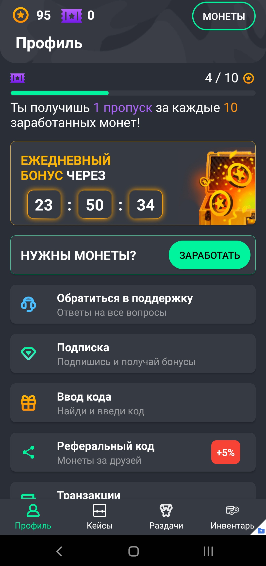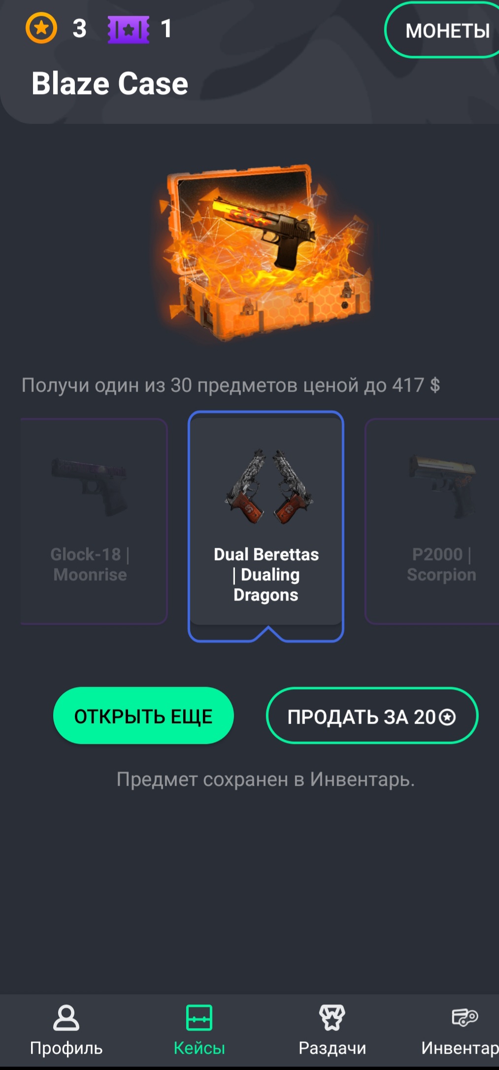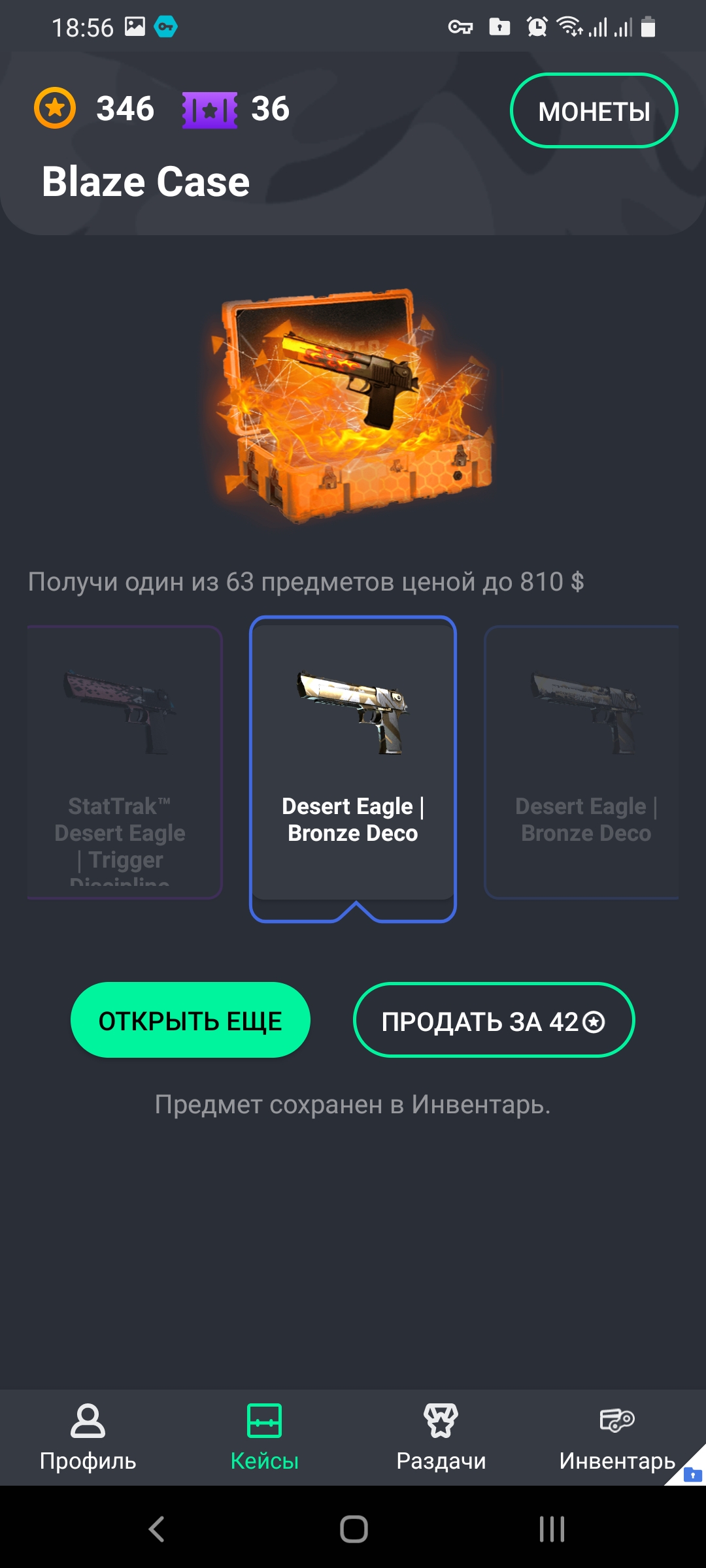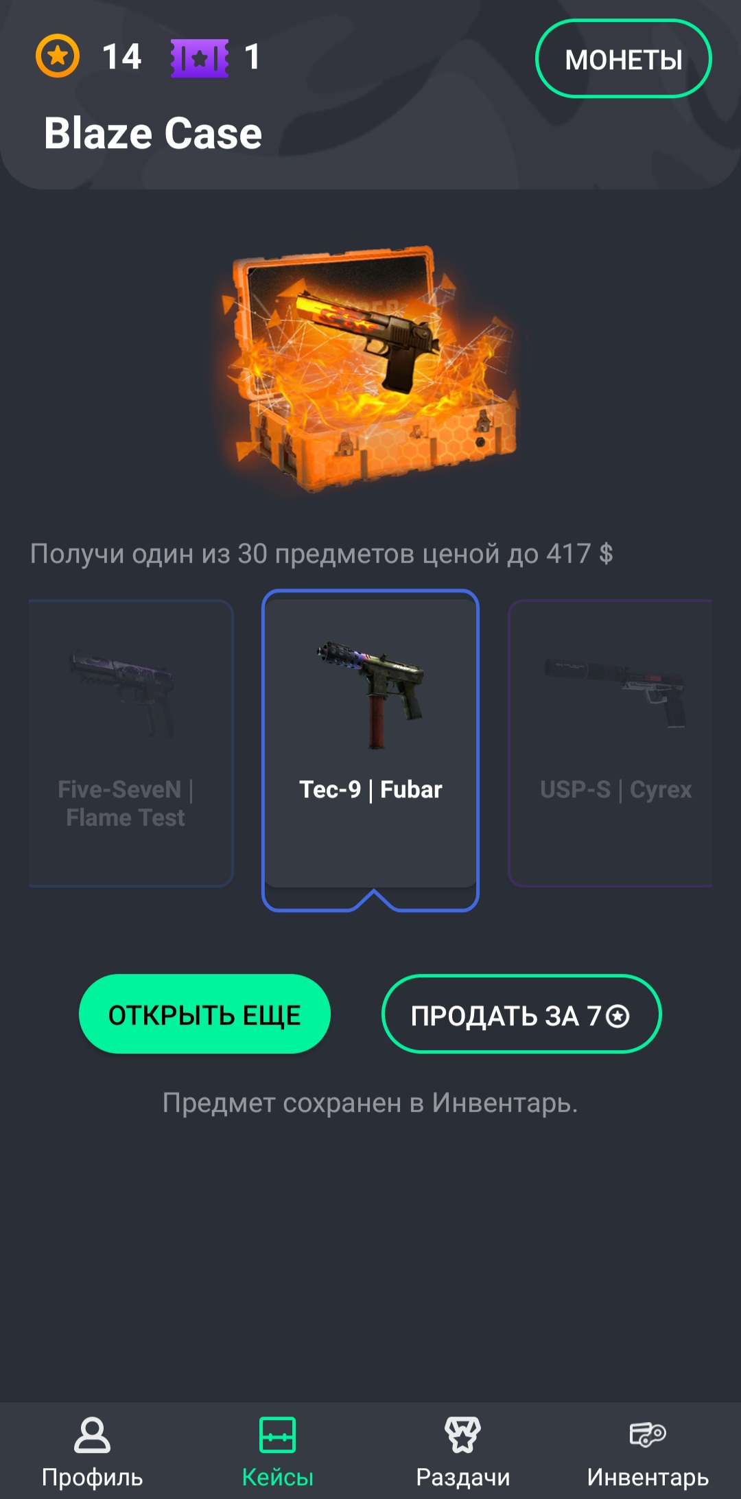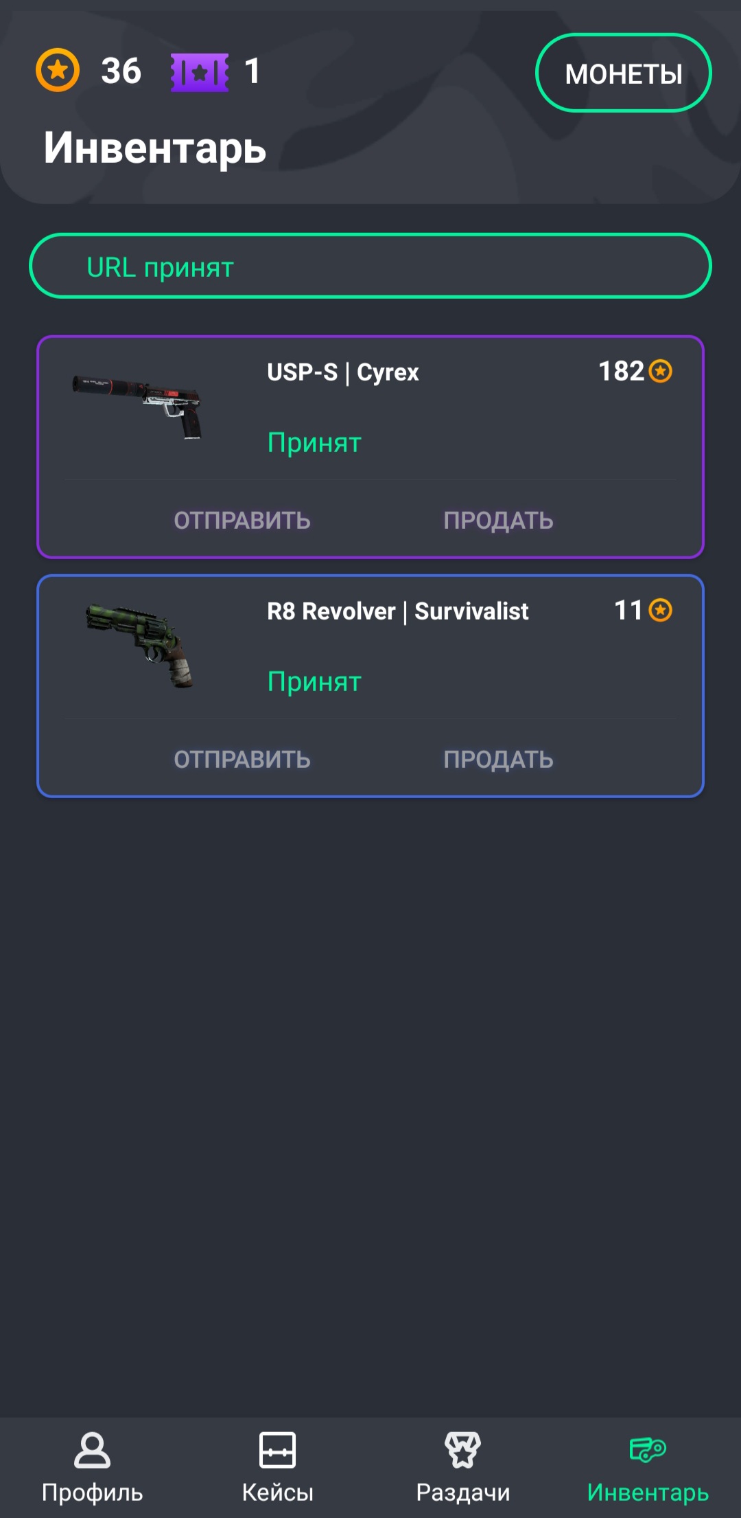 БЕСПЛАТНЫЕ СКИНЫ CSGO Сап, есть одна тема, качаем приложение GoCaseshttps://play.google.com/store/apps/details?id=com.gocases. Вводим промокод J89eRLN9 на 20 монет (не бойтесь, я за вас вообще нихуя не получу, я так самого себя рефал, это нихуя не дает, если зотите поищите другие коды, все по 20 дают), так же у вас будет еще один бесплатный кейс, на 25+ монет, итого имеем уже на старте 50~ монет. Кликаем каждый день на забрать бонус, забираем от 1 до 5 монет. Для регистрации нужна gmail почта, для скинов нужен любой STEAM аккаунт на котором включен SteamGuard (защита включена). Т.е. даже не надо закидывать 5$ для разблокировки торговой площадки, главное чтобы обмен работал и всё. Чуете чем пахнет? Это все можно абузить, уже как пару месяцев оттуда вывожу стабильно скины, никто не мешает тебе сделать по 20-30 gmail, и столько же аккаунтов STEAM. После получения переводим на свой главный аккаунт (перед этим ждём 7 дней). Самый дешевый кейс стоит 69 монет, там скины 8-15 рублей стоят, но можно пооткрывать кейсы подороже, за 109 монет. Мне выпадали шмотки и по 100 рублей (p90 virus, usp-s cyrex и т.д пруфы на них ниже, потому что только 4 картинки помещается). Так же можно выполнять задания за монеты, сам выполнял парочку, но это нелегко, так можно выполнить по типу установить ТикТок и т.д., пару сотен точно заработал таким образом. В день уходит минут по 5 на сбор всех монет со всех аккаунтов. Сами аккаунты (что стим, что гугл почты, регаются тоже быстро, в день удаваллсь по 7-8 штук делать аккаунтов).