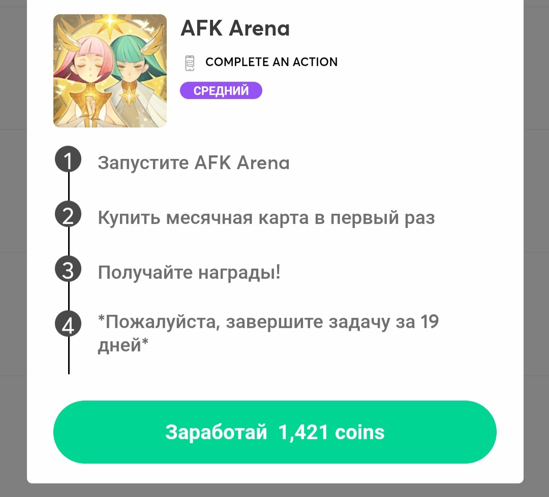1421 монет. Нажимаем заработать и выбираем "Fyber". Выбираем данное задание AFK Arena. Нажимаем получить 1421 монет и скачиваем приложение. Заходим в приложение и проходим обучение. Далее нажимаем на крестик в правом верхнем углу и покупаем Месячную карту за 379р