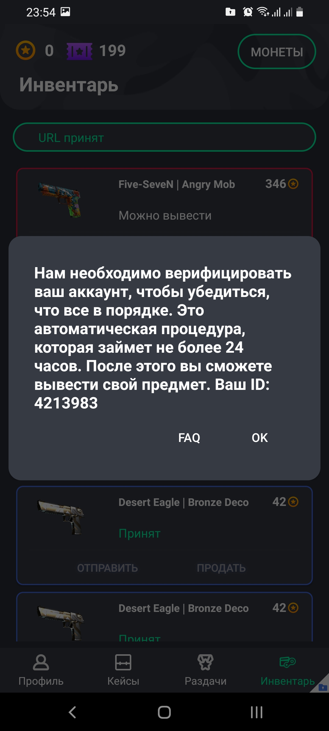 Вот короче, я даже ниче не присылал ему, т.к уснул, в итоге мне так "верифицировали", без этого. Долго шел Five-Seven за 3 доллара (5 минут ждал), уж было засомневался, но видимо ждали продавца, все остальное норм вывело.
