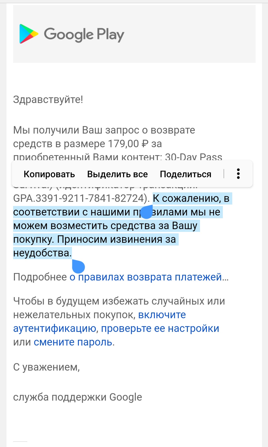 781 монет. Нажимаем заработать и выбираем "Fyber". Выбираем задание Rise of Kingdoms. Нажимаем получить 781 монет и скачиваем приложение. Далее заходим в игру и проходим обучение, после обучения нажимаем в левый верхний угол и донатим 75 рублей (мы их вернём) Как только нам начислили монеты в GoCases мы выполняем следующее: Откройте страницу https://play.google.com/store/account (скопируйте ссылку и вставьте в браузер) Откройте вкладку История заказов. Найдите заказ. Нажмите Запросить возврат средств или Сообщить о проблеме и выберите подходящий вариант. Заполните форму и укажите, что хотите получить возврат средств. Появится уведомление "Благодарим за сообщение". После этого вы получите электронное письмо с нашим решением. Обычно ответ приходит в течение 15 минут, но в некоторых случаях нам может потребоваться до четырех рабочих дней. Когда подаете заявку на возврат средств, выбирайте "Покупка сделана случайно" и в описании пишите "Завис дисплей телефона" либо сам телефон, придумайте. Мгновенно нам одобрили возврат, теперь остаётся ждать.