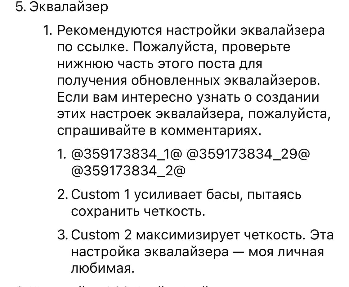 Всем привет, купил наушники SONY WH1000 XM3. Слушаю через айфон и настраивал через эквалайзер в приложении сони. Но мне кажется что все же что-то да упускается в треках. Нашел на реддите пост и отличными настройками эквалайзера(хотелось бы хотя бы за основу их взять), но совсем не понимаю как их в итоге найти потому что реддитом впервые пользуюсь. Собственно на пикриле увидите, и надеюсь подскажите что делать с этой информацией