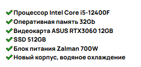 Короч мой нынешний комп стал сам перезагружаться, проблема в проце, оперативке и в видюхе. Я подумал что лучше просто взять новый комп или собрать самому чем модифицировать этот (комп от 2021 за 80к) =================================== Короче вот билд: rtx 3060 ti ryzen 7500f 32 gb озу (в 2 плашках) msi 650m gaming plus Накопитель samsung 990 evo plus на тб Chieftec core на 700 вт нн вентиляторы 209 за штуку и корпус Zalman n5 MF =================================== Да можете обосрать меня я готов жрать говно