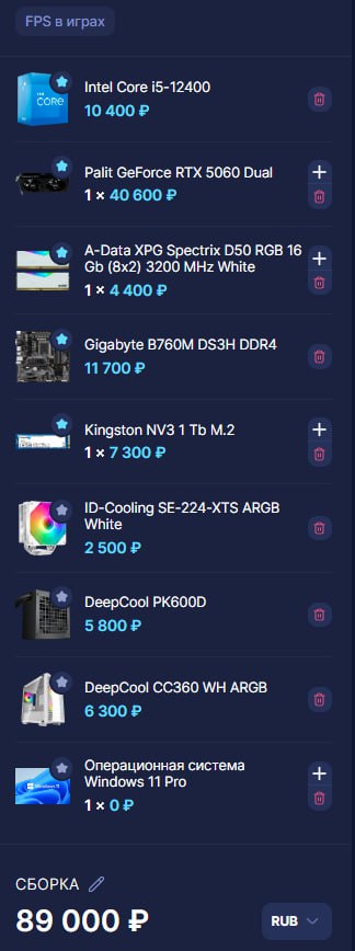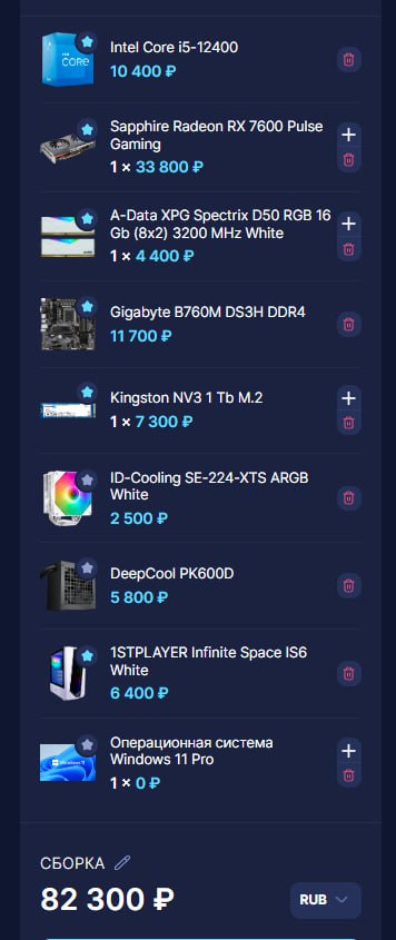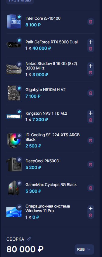 Покупай всё на озоне, там дешевле, итак, мой вариант сборки на 100к: Ryzen 7 7800x3d Gigabyte eagle ax b650 am5 12к Rx 6800xt (авито кнч) 25-29 к (посмотри видосы на ютабе про покупку видюх на авито перед покупкой) Crucial ddr5 pro 2x16 10к Корпус:( бля купи с авито) 2к M2 NVMe Kingston 1tb 5к Cougar xtc 750w 5-6к Башня 230-280 ватт 2-4к 3к остаток на вентиляторы, или на перераспределение бюджета, хз честно, разрешаю тебе купить норм корпус