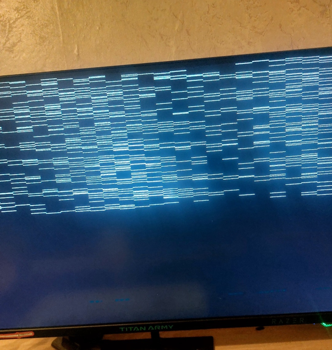 Господа, случилась неприятная ситуация, вытаскивал видюху, после этого появились артефакты, приведенные на картинке ниже. Из интересного - артефакты полностью отсутсвуют в биосе. Диспетчер задач, перестал видеть видеокарту, хотя раньше все было ок. Дрова переустонавливал, шлейф чистил, другой кабель и монитор пробовал, ничего не меняется. Подкидывал другую карту - все нлрмально работает. Если есть люди сталкивавшиеся с подобной ситуацией, растолкуйте необрпзованному.