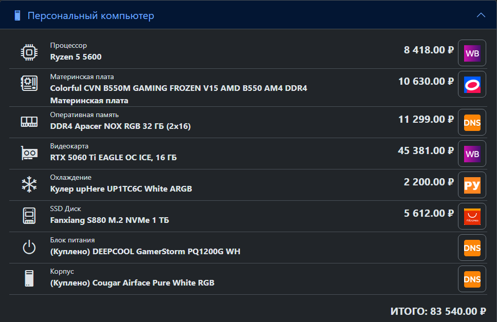 Здарова. Я в общем дундук и хотелось бы узнать у более тех кто шарит совместима ли моя сборка. Ничего ещё пока не покупал. Но к декабрю уже хочется сидеть в своей будке с компиком. Список: Процессор: ryzen 7 5700X OEM Матка: MSI B550 PRO-VHD WIFI Охлад: ID-COOLING FROZN A620 PRO SE Оперативка: DDR4 Kingston Fury Beast 32gb (16x2) Видюха: GeForce RTX 5060 Ti Palit Infinity 16gb SSD: 1TB ADATA Legend 900 БП: Ocypus Delta P850