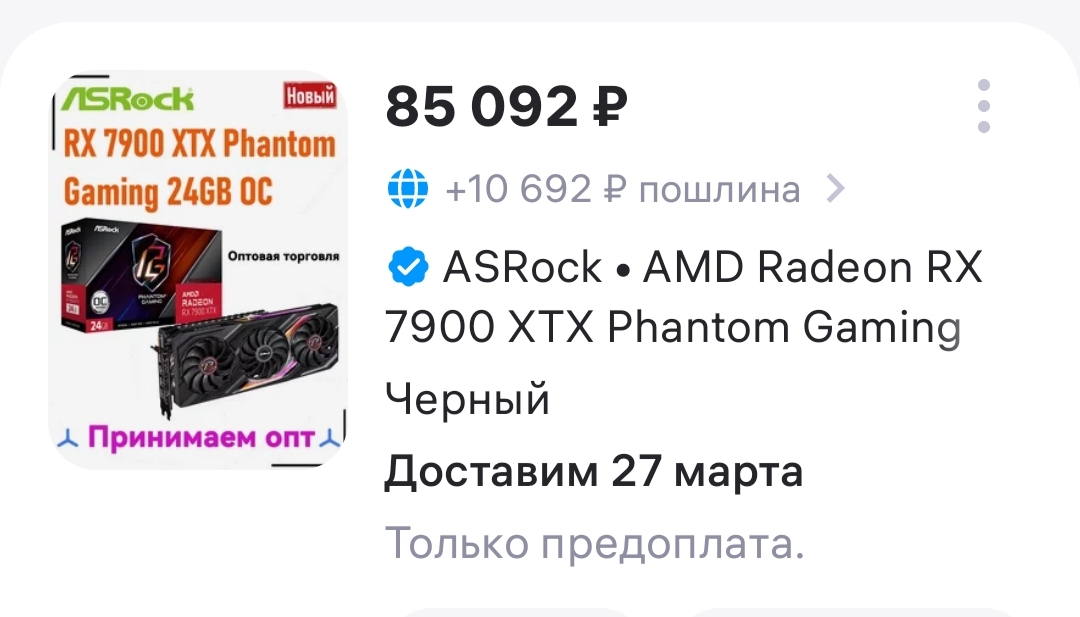 Да хватит пиздеть. Самая дешёвая 7800 на пальберисе у Модерн девайса в октябре стоила 53 рубля. Потом цены только росли. Сейчас она уже почему-то 4070 обогнала, хотя в том же октябре была дешевле рубля на 3-4.