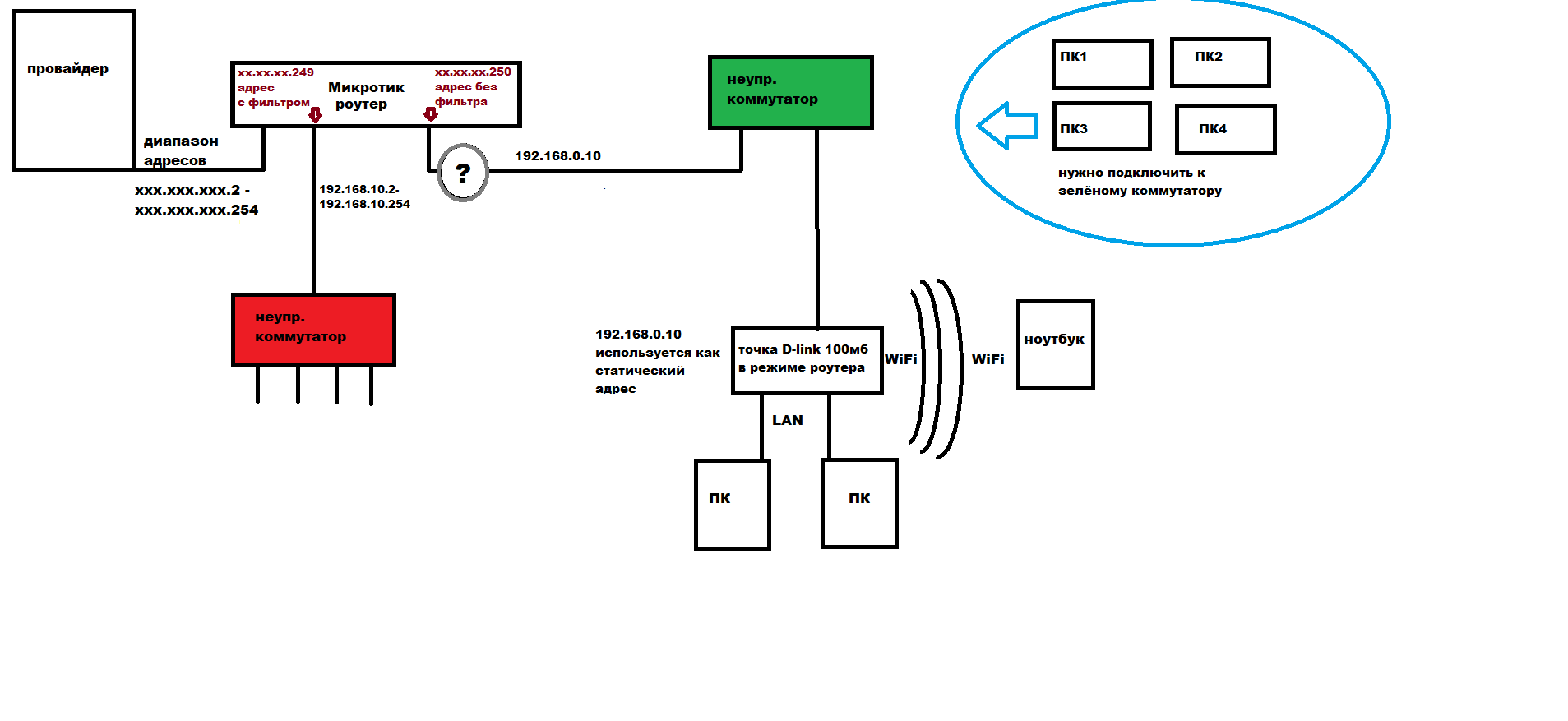 >>7193915 Ну в этой схеме сильно непонятно чем D-Link занимается, кроме вайфая на ноутбук, если зеленый коммутатор все равно висит рядом. >Можно перетянуть провод от микротика к д-линку Они же соединены через зеленый коммутатор, второй-то провод зачем? >тогда потом придётся настроить ещё один порт на микротике Вообще непонятно. > Можно докупить ещё роутер в позицию Тоже не понять, но еще один роутер точно там не нужен. >Или я сделал херню вместо сети? Ну скорее всего. Сейчас все вообще выглядит так, словно эти 4 ПК и тот со знаком вопроса надо просто воткнуть в зеленый и все. Чего за проблемы-то?