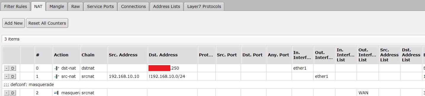>>7194104 А dstnat там вообще что делает? Это имеет смысл какой-то или ты не знаешь? Ну я микротиков не видел, но логика подсказывает, что первое правило вообще не нужно, а второе должно выглядеть просто как src. Address: 192.168.10.0/24 dst. Address: xxx.xxx.xxx.250 - ну что там у тебя замазано красным
