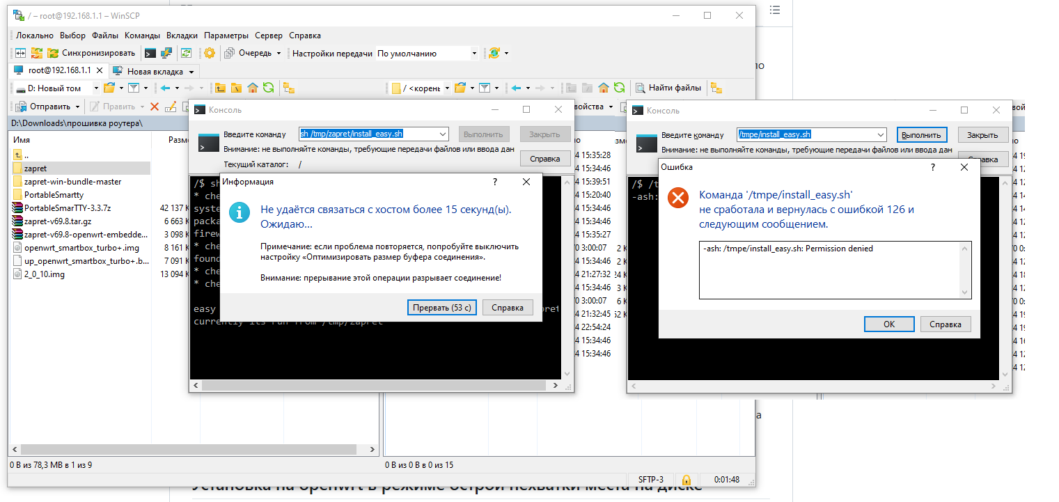 Установил на роутер опенврот, закинул папку с запретом, но не получается запустить скрипт. Виснет на этапе чекинга привилегий. В чем может быть причина? Где найти этот "буфер соединения"?