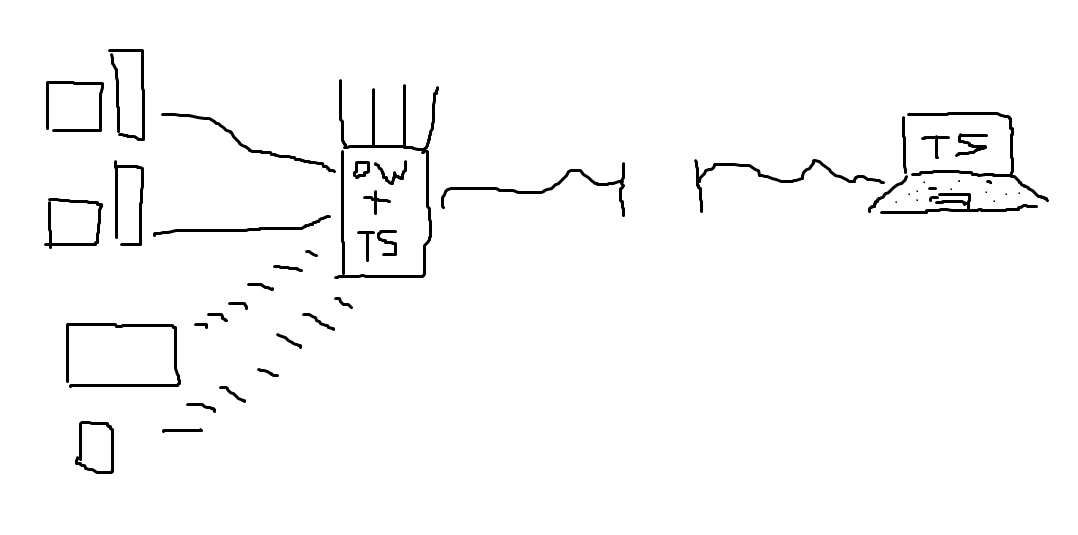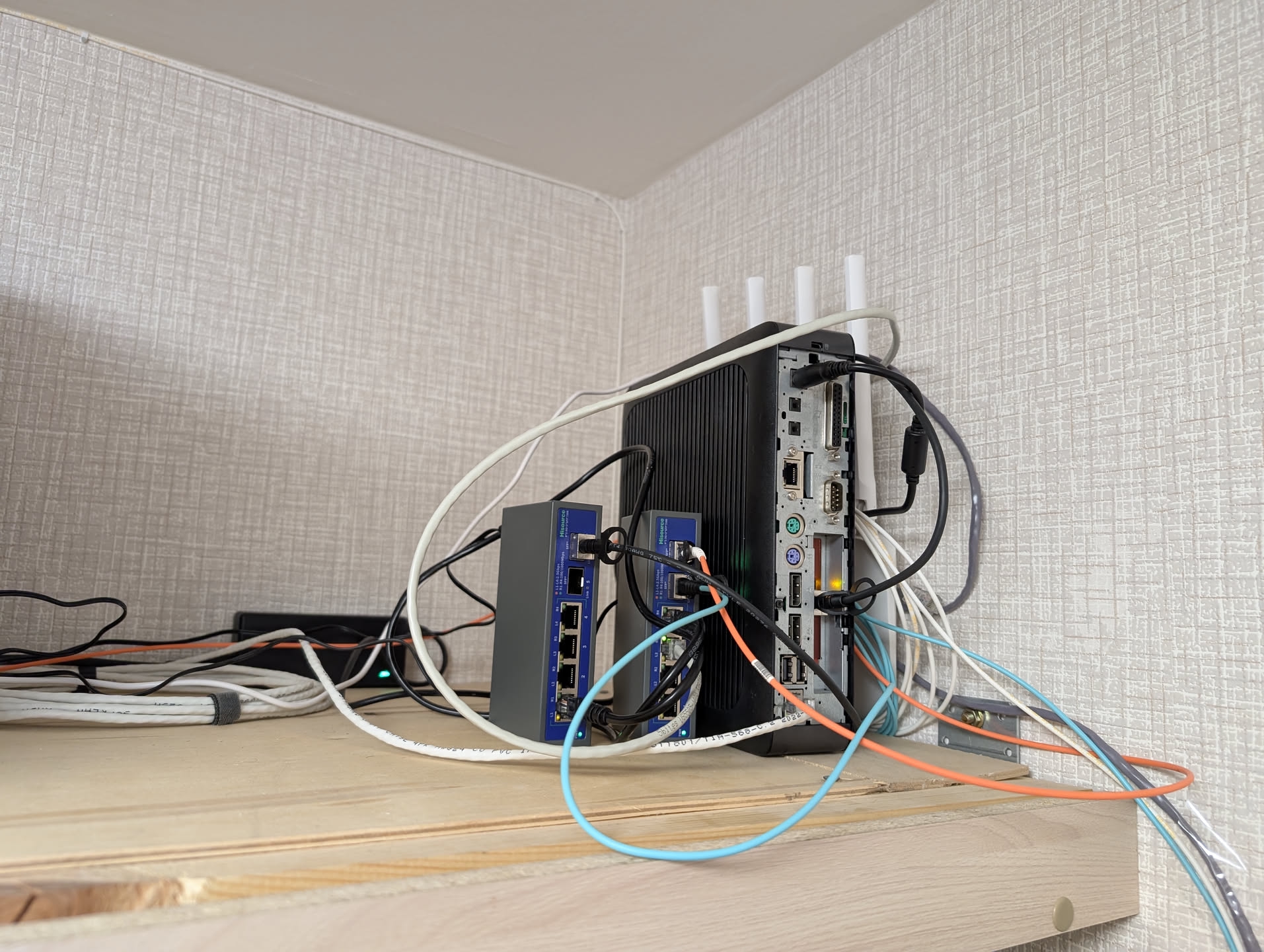 Когда-то нужно было подключить несколько ПК в отдельной комнате к интернету без фильтрации. Повесил рядом на всякий случай (зелёный) коммутатор. Случай настал и нужно к этому коммутатору теперь подключить 4+ ПК. А в позиции, где изображён знак вопроса в перспективе нужно подключить ещё один ПК.