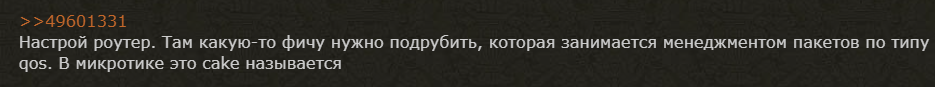 >>7186050 (OP) Жестко тормозит в разных онлайн играх, типа кс и прочее. Причем только последние несколько месяцев так и это бывает рандомно. Один анон мне написал: >Настрой роутер. Там какую-то фичу нужно подрубить, которая занимается менеджментом пакетов по типу qos. В микротике это cake называется Я нихуя не понял, можете намекнуть, что это за "фича" и где ее подрубать? Гугл выдает только часовые лекции и горы текста. Я даже не ебу что именно мне нужно гуглить..