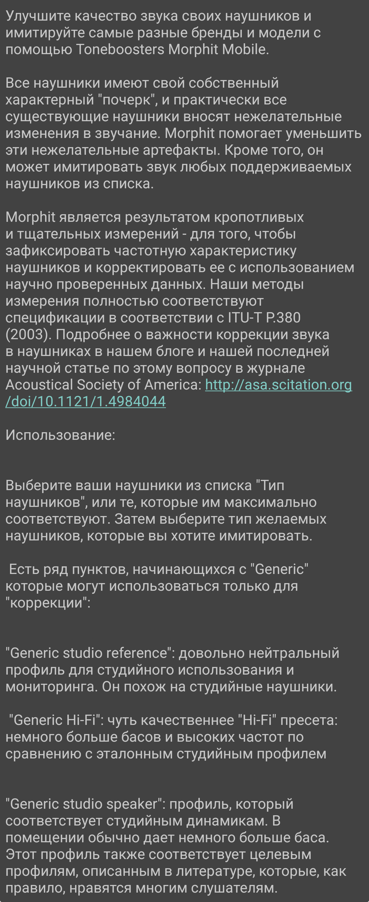 Коррекция АЧХ: Хочешь больше деталей/баса/воздуха/сцены или просто улучшить звук? Грамотная эквализация обычно способна дать это https://autoeq.app/ - генерация пресетов под твои наушники. По умолчанию эквализирует в кривую Harman target. Есть предварительное прослушивание результата. https://squig.link - Интерактивный браузер АЧХ + эквалайзер и тон генератор. Огромная база замеров. Качество замеров варьируется от ужасных до хороших. https://www.reddit.com/r/oratory1990/wiki/index/list_of_presets - авторские пресеты от oratory1990. Одни из самых точных и технически правильных замеров в общем доступе (за исключением пары косячных моделей) https://graph.hangout.audio/ - браузер АЧХ и замеры от Crinacle https://www.reddit.com/r/headphones/comments/1780005/bk_5128_graph_database/ - сборник замеров на B&K 5128 без исходников. Графики можно вытащить через WebPlotDigitizer https://rentry.org/IEM-EQ-Guide - подробный гайд по ручной эквализации (нужен VPN)