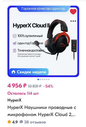 >>7308595 Самые дешёвые Cloud 2 на Озоне от Озона стоят 9к. Те что у тебя на пике за 5 - не уверен что оригинал (ещё и эта надпись "100% аутентичный" не внушает доверия, хотя прям точно утверждать не могу), так что бери только если прям уверен, а то в отзывах пишут кто паль, кто оригинал, + конкретно на cloud 2 отзывов вроде нет.