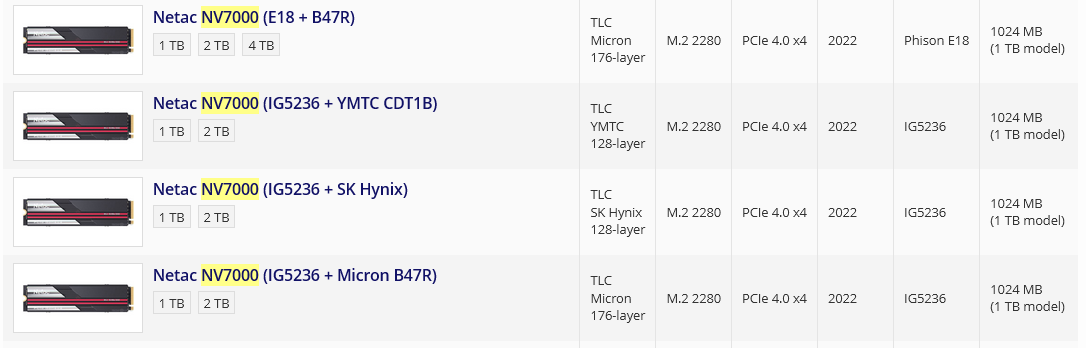 • Asgard AN4/Netac NV7000/Digma Top G3/Fanxiang S770/Movespeed With DRAM Cache/Kingspec XG7000 Pro/OCPC MBL-410/AGI AI838 (PCI-E 4.0, YMTC TLC 128L, DRAM, контроллер IG5236)