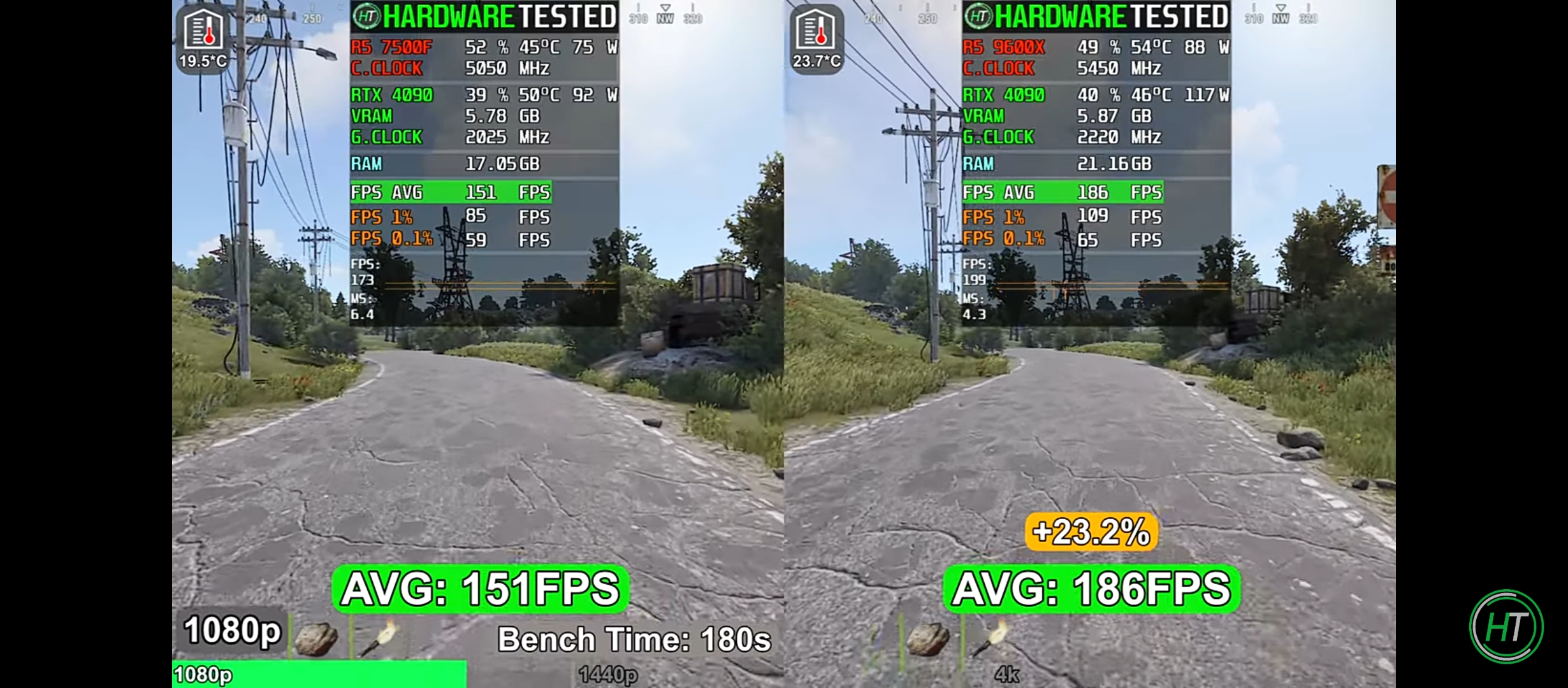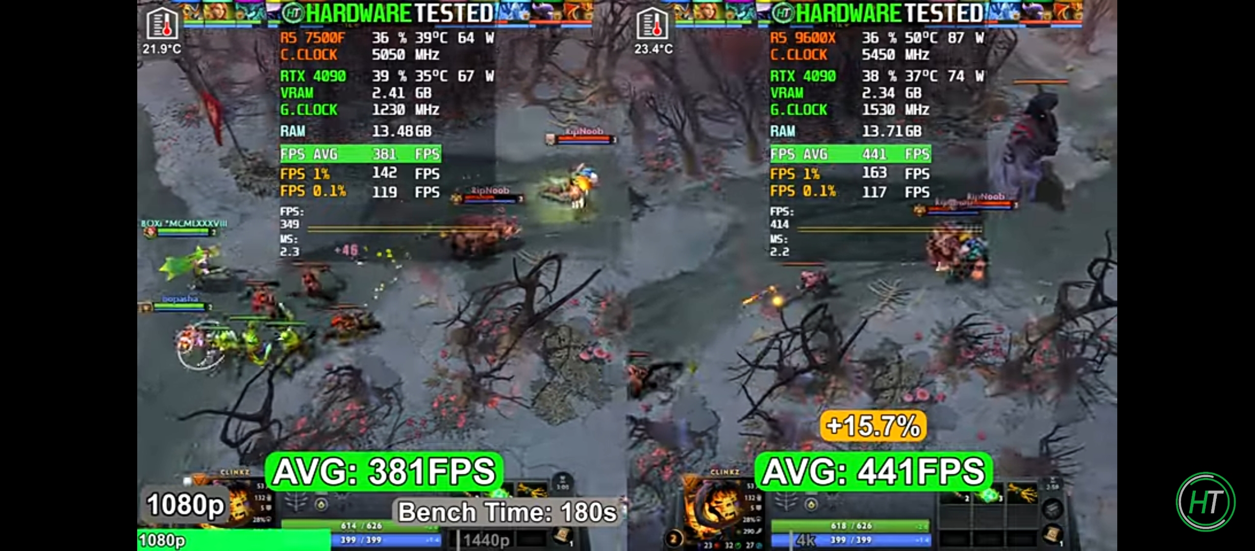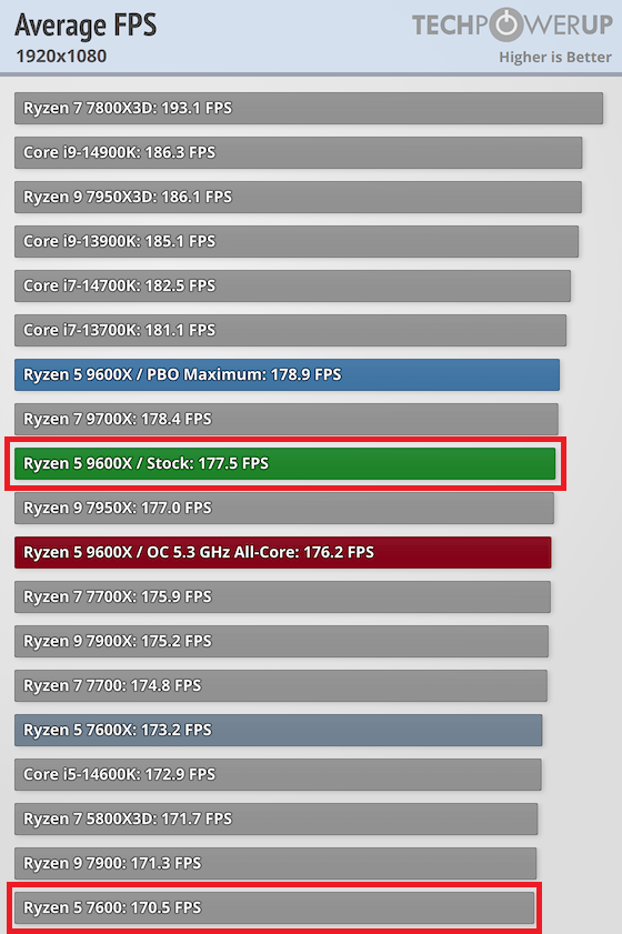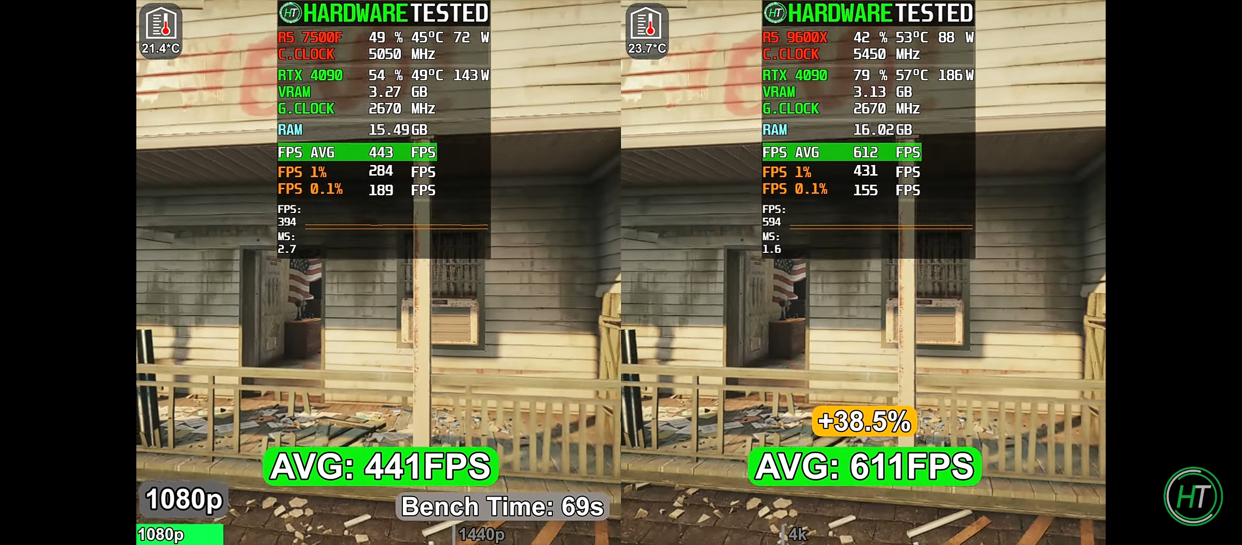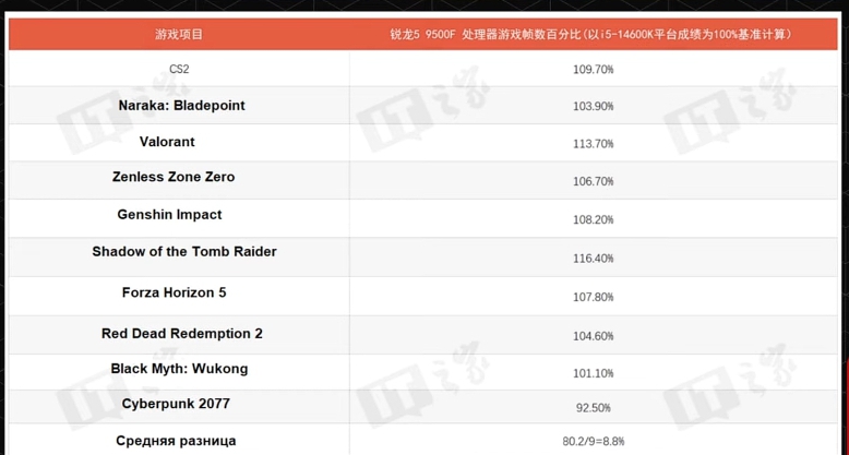 Согласно слайдам AMD, Ryzen 5 9500F показывает до 24% прироста производительности в AAA-играх по сравнению с предшественником Ryzen 5 7500F. Усреднённый прирост по 10 популярным тайтлам составляет около 9%. В соревновательных играх прирост достигает в среднем 11%. Пиковый прирост зафиксирован в Baldur's Gate 3 и World of Warcraft.