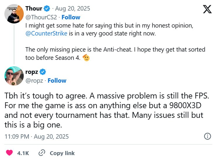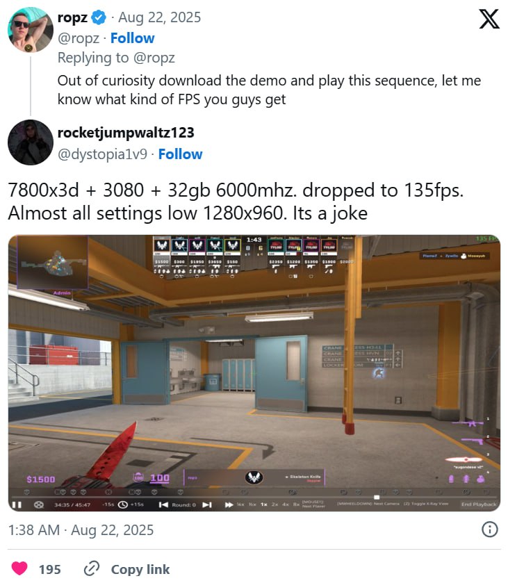 Киберспортсмен Ropz сделал любопытное заявление – по его словам, только «игровой король» Ryzen 7 9800X3D может обеспечивать в Counter Strike 2 стабильно высокий фреймрейт без падений ниже 150-170 кадров. В качестве доказательства он попросил у своих подписчиков провести тестирование на своих системах с использованием одного из его турнирных реплеев. И как оказалось – даже 7800X3D или 9950X3D просаживаются до 130 кадров. Так что если хотите лишить себя возможности списывать проигрыши на «железо» – придется раскошелиться на 9800X3D.