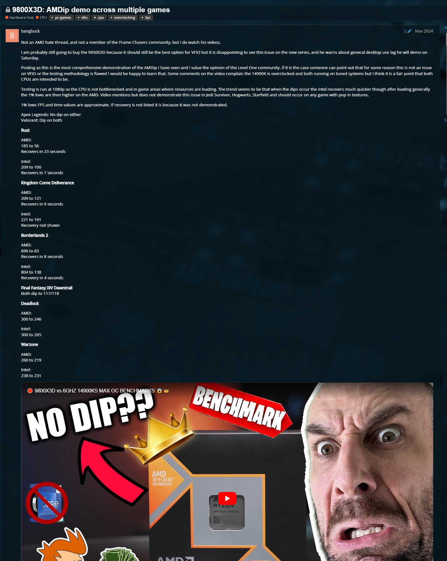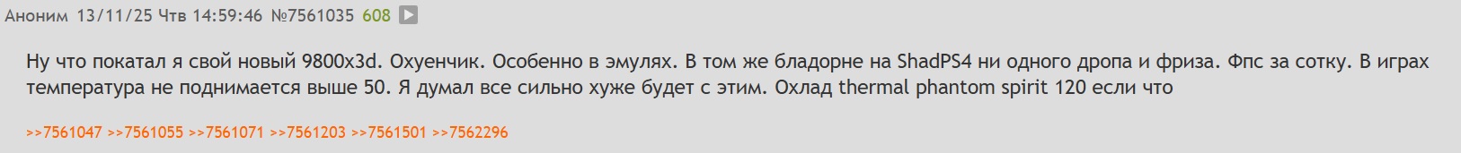 есть видосы где 9800х3д лагает и пердит в диспечере? или демонстрация где шизы открывает в проводнике папки-эскизы и у него типа не плавно прокручивается? почему никто из крупных оборщиков - тот же техноиисус геймернексус не ссыт на амуде и не разгоняет зраду с какими-то лагами?