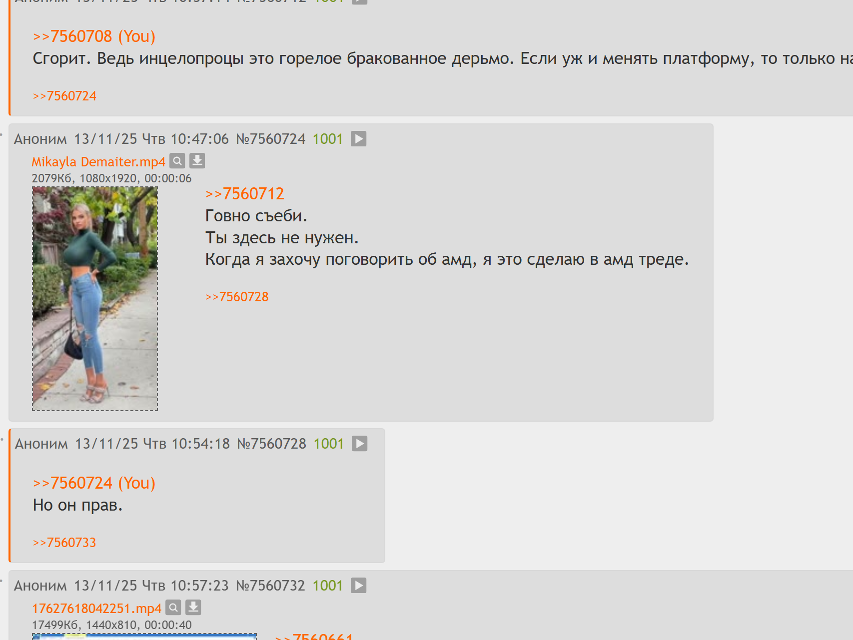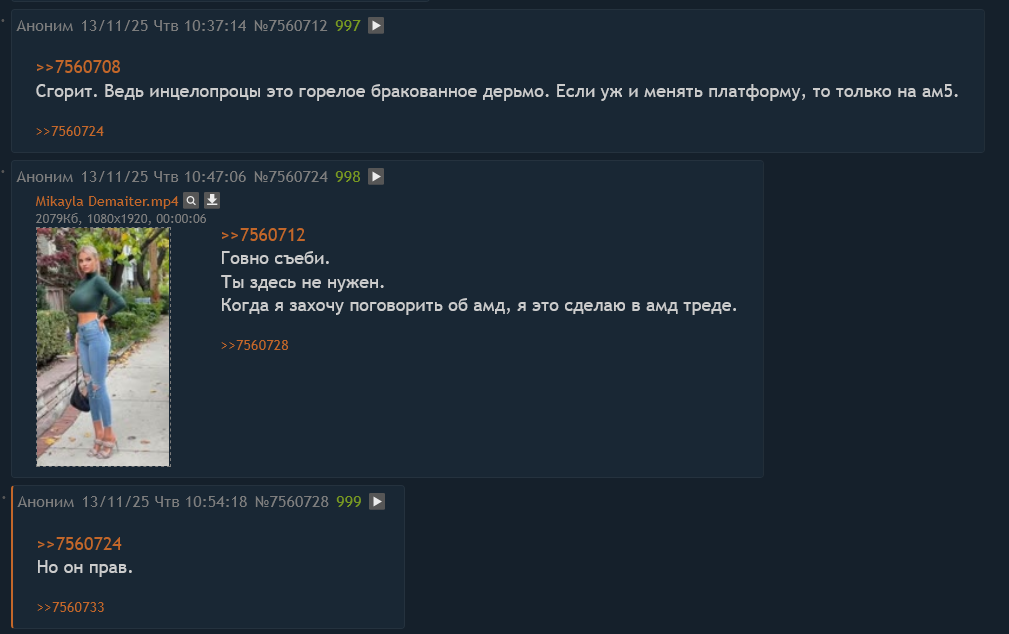 пиздец. я просто в ахуе с вас господа. интелбоям больше нечем превознемогать кроме записи роликов с эскизами и ПЛАВНЫМ проводником с прокрутками. я даже не знаю что тут написать - это реально клиника. ладно бы этот мертвый сокет 1700 и 14900кф (или на что вы там дрочите) стоил 20к проц и 20 к материнка - там же цены ебанешься. да даже не в ценах дело - дело в том что интел ПИЗДИТ всегда и везде. Там дефект на уровне hw от которого проц умирает тупо. Одно только это сразу нет - какие нахуй проводники и прокрутки. ты включаешь комп свой в один день и там привет хуй. все. советовать купить такое это просто шиза. Дада в последних партиях это исправлено. верим да. еще эти ядра кастраты которые экономные? которые нахуй не нужны никому в пк. за что?!