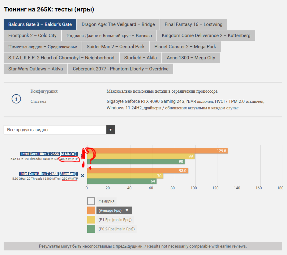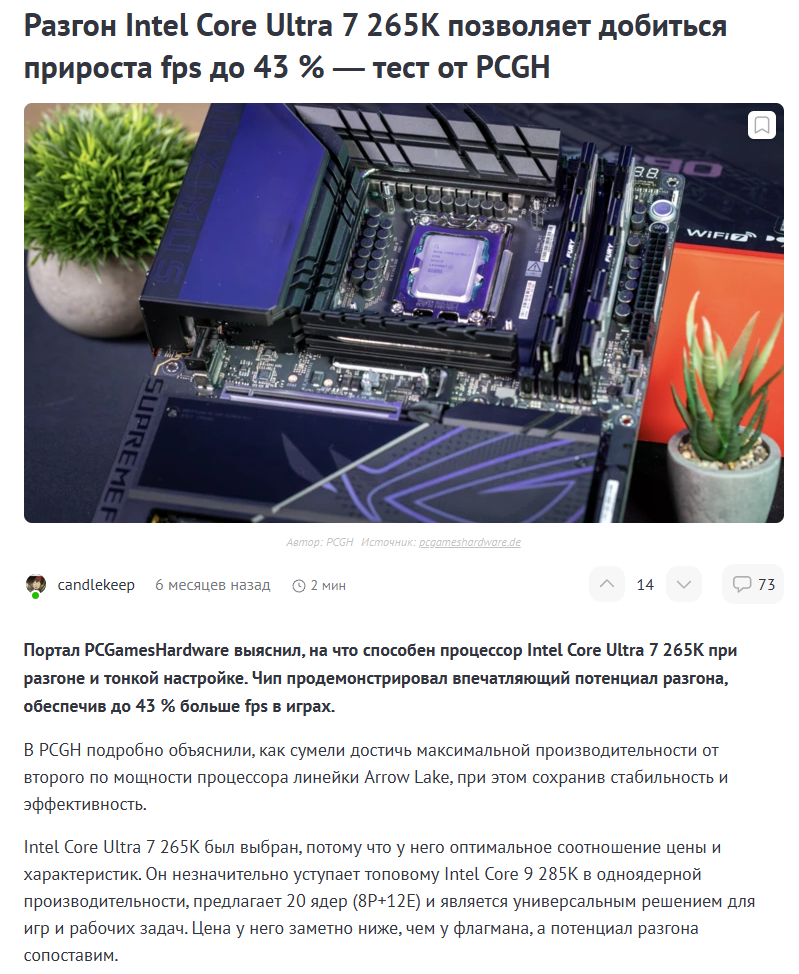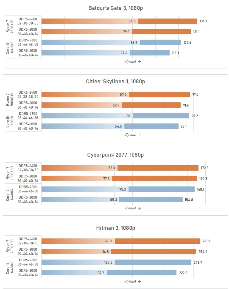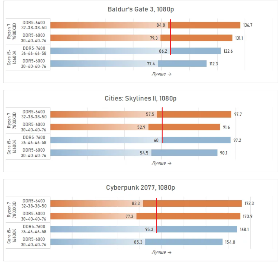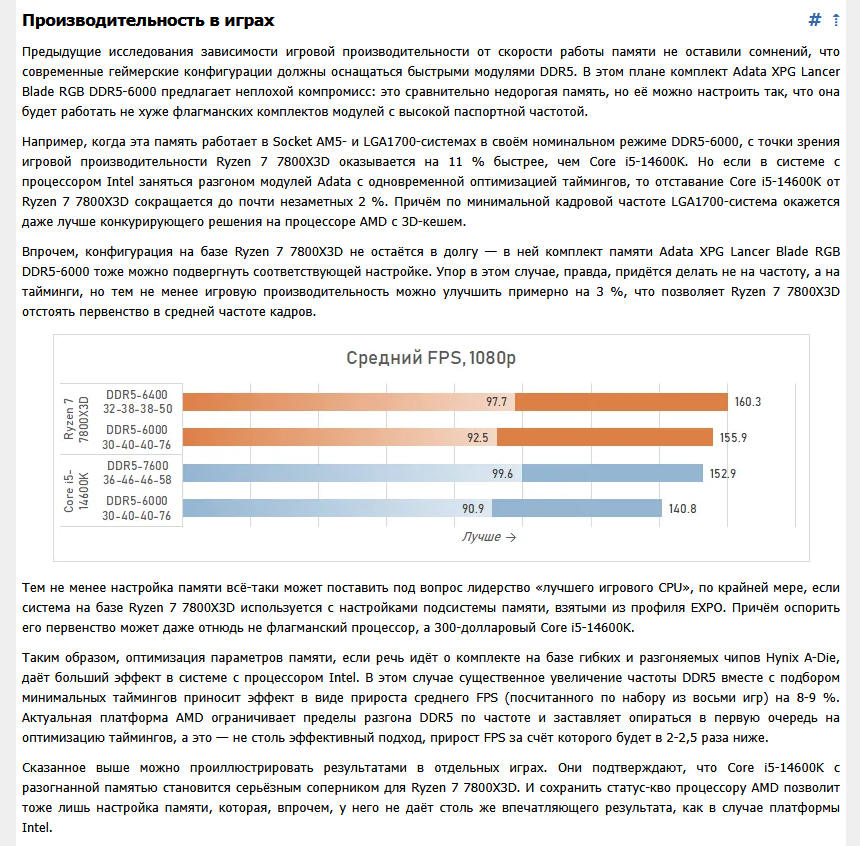 >>7571826 И в этом тесте они проверяли тупо профит от разгона памяти. А ведь 14600к можно по ядрам разогнать на какой-нибудь самой дешманской з-плате (все равно выйдет заметно дешевле, чем калплект с 7800х3д), и тогда 14600 в некоторых играх неиронично будет 3д-кал обгонять, в том же киберпанке. Вот и думайте.