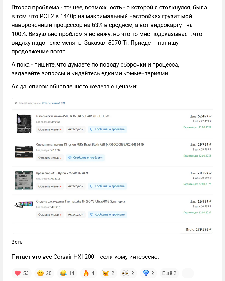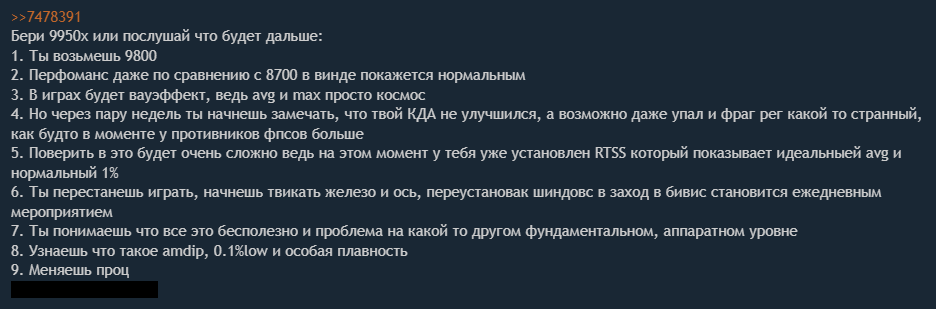 Результат можешь даже никому не показывать, т.к. там будем все оч хуево.. Но это даст принятие amdip, после этого ты будешь честен хотя бы сам с собой, потому что принять amdip психологически очень больно, когда ты взял "топ железо" и въебал столько бабла Потом приходи, тут помогут пересобраться на lga1700 и монокристалл