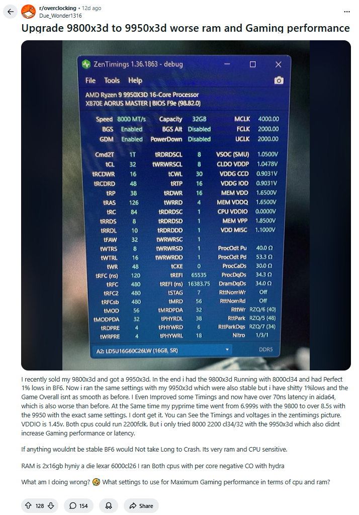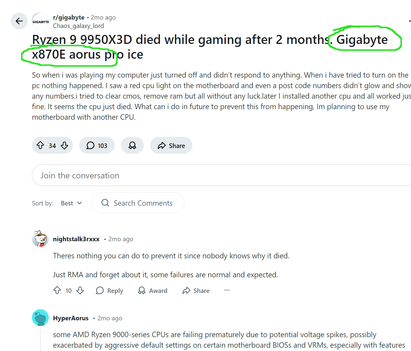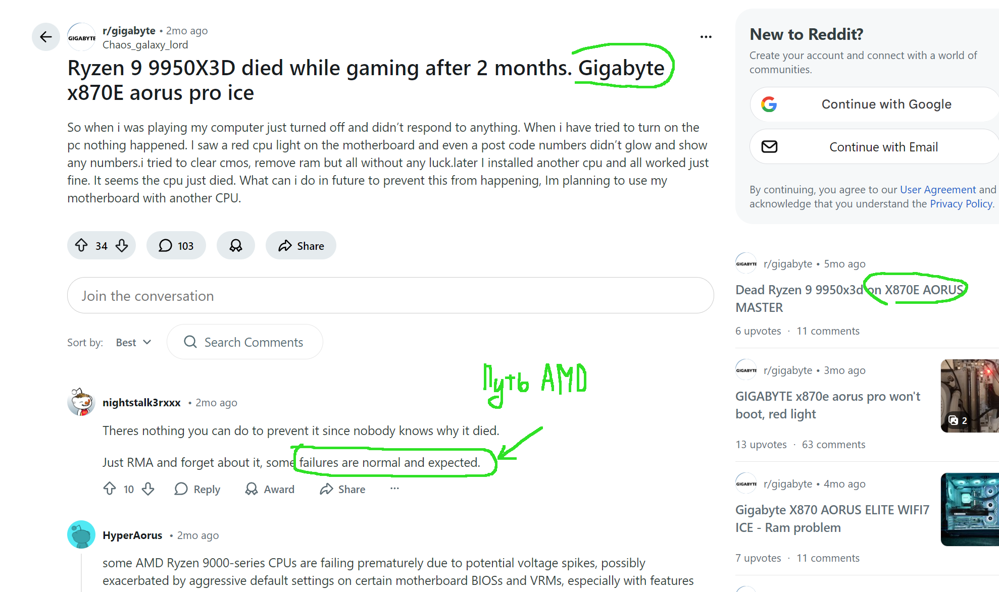 у мудоней я писал про тупорылые настройки планировщика потоков от амуде который багнутый и проблемы со схемой энергопитания которую вроде как исправили у свинтела с парковкой ядер но это говно виндоус тут без претензий. да с х3д кешем залупа какая то на асроке - это не говно в проц залили видимо вендор захотел выпендриться и задрал вольтаж сам. хотя я лично знаю пару челов кто взял 9800х3д и мать асус уровня рог арех просто воткнули и пользуются.