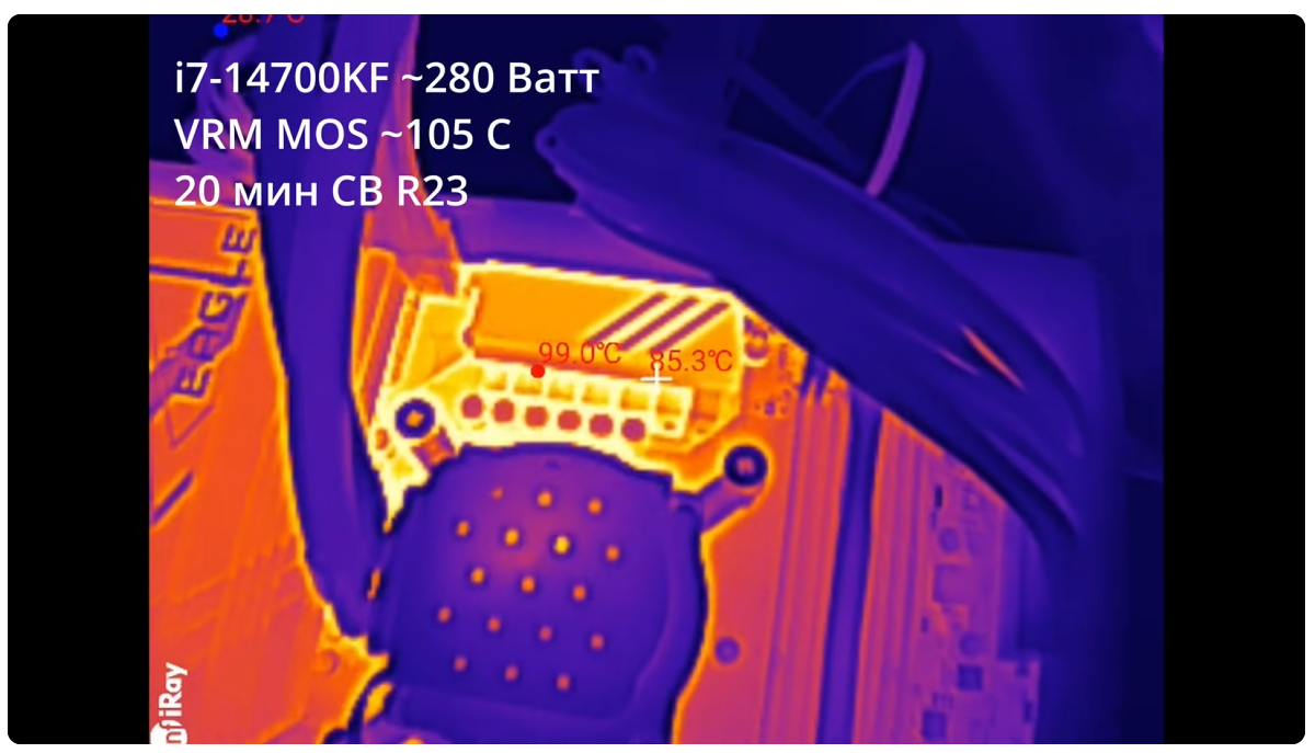 >>7571875 >>7571876 Блядь, там 8 фаз из них половина фейк. Вы ебнутые? эта хуета без радиатора при 100ваттах уже будет 115 градусов в нагреве, 150-200ватт материнку просто уничтожит нахуй. 14700к нужно минимум 12-14фаз с хорошим охлаждением.