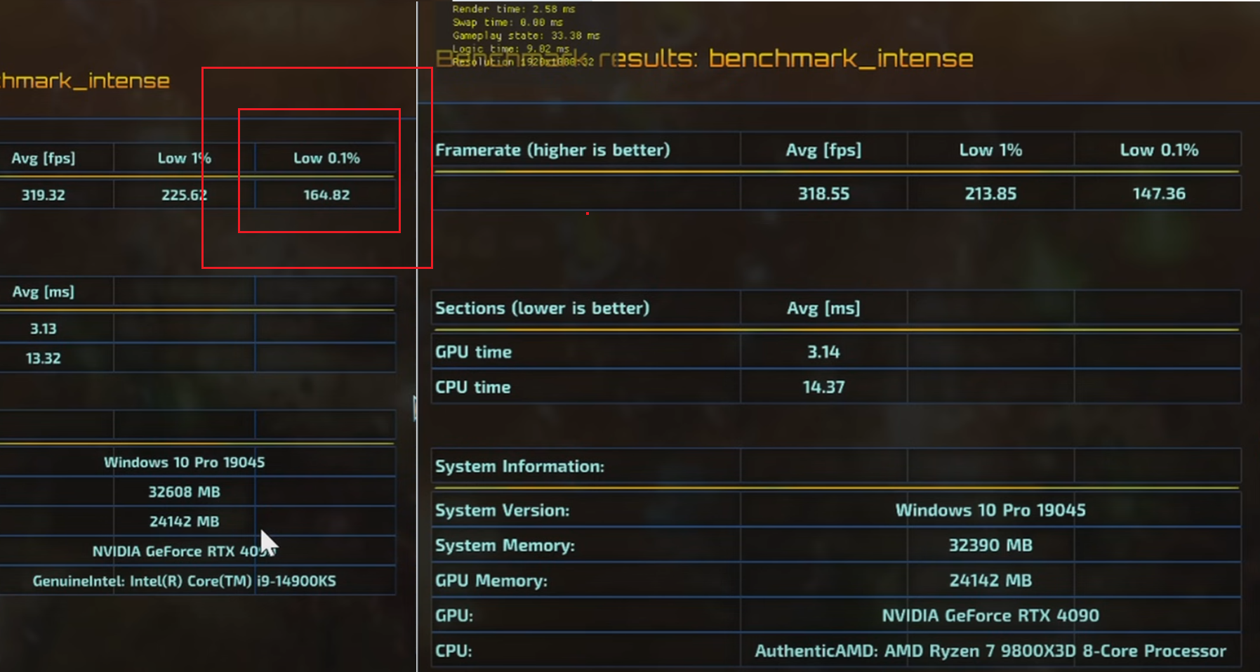 >>7569799 >Тип с 14900 и памятью 8600 когда по рынку бегал, у него фпс до 89 падал, а на амуде ниже 100 не просаживается. Вот и думайте. От сейва может тоже фпс уехать. Надо на одном сейве проверять. Я на своем сейве гонял, охуел, что у меня 0.1% на 9800х3д был 60фпс. Потом загрузил ранний сейв до прохождения ДЛС и было уже 80фпс по 0.1%. Ебнутые проджекты так свою игру и не поправили. Также нельзя исключать, что и карта 50 серии будет выдавать больше фпс в таком сценарии, чем карта 40 серии, просто за счет большей шустрости RT ядер. Тут нагрузка на РТ ядра слабая, так что скорость самого ядра может повлиять на результат.
