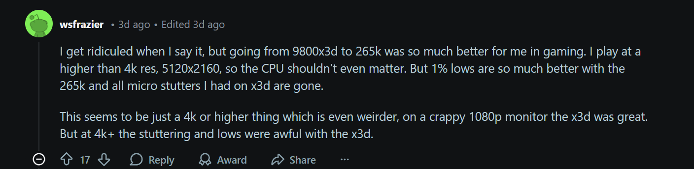 >X3D является лучшим игровым Ошибка. Лучший игровой процессор это 5090. Дурачки взявшие амд для игр, банально не задействуют его, потому что тоже играют с упором в видеокарту. С тем же успехом ты можешь взять зеон или эпик за 10к баксов для игр. Он будет ровно также незадействован.