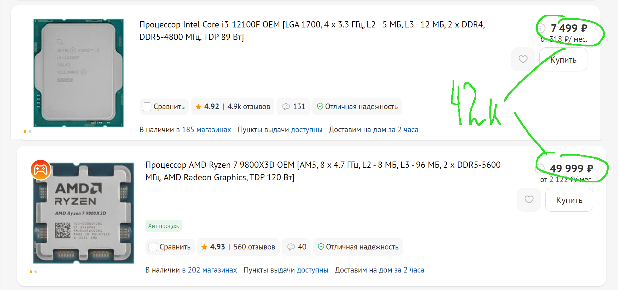 >>7570479 Так я купил инцел на б660 и ддр4 по совету местных инцелодаунов, которые говорили что 12400 для всего хватит, а потом оказалось, что без ддр 5 инцел 14600 сосет у 7500f, а уж про таких гигантов как 7800х3д и 9800х3д я вообще молчу.