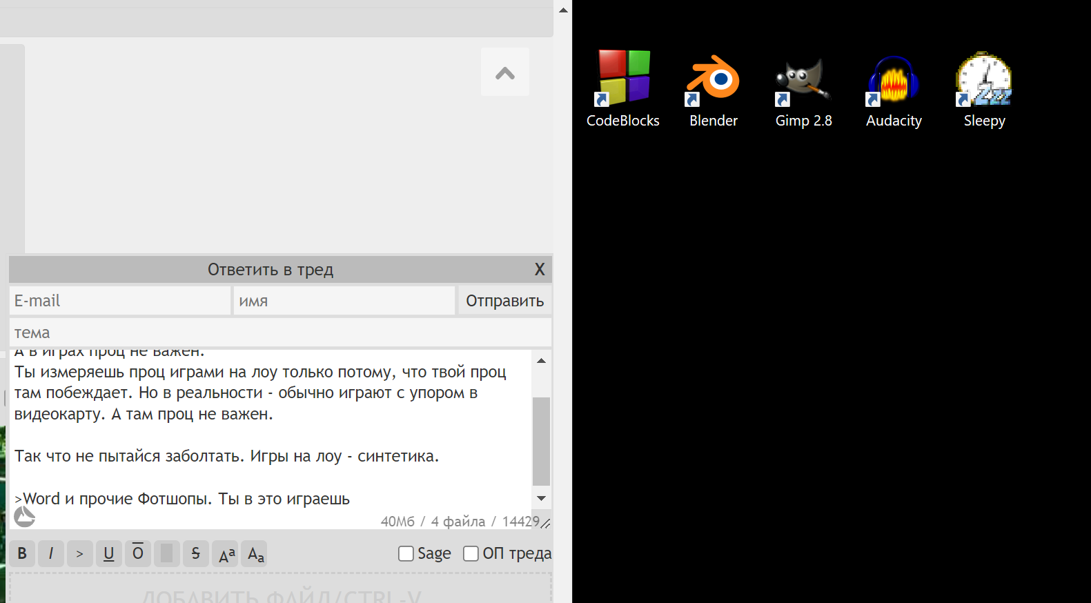 >Word и прочие Фотшопы. Ты в это играешь Ну да. Рабочие задачи делаю. Я тот самый чел которому важны тесты блендера и скорости компиляции с++. Твоё амд в этом СОСЁТ.