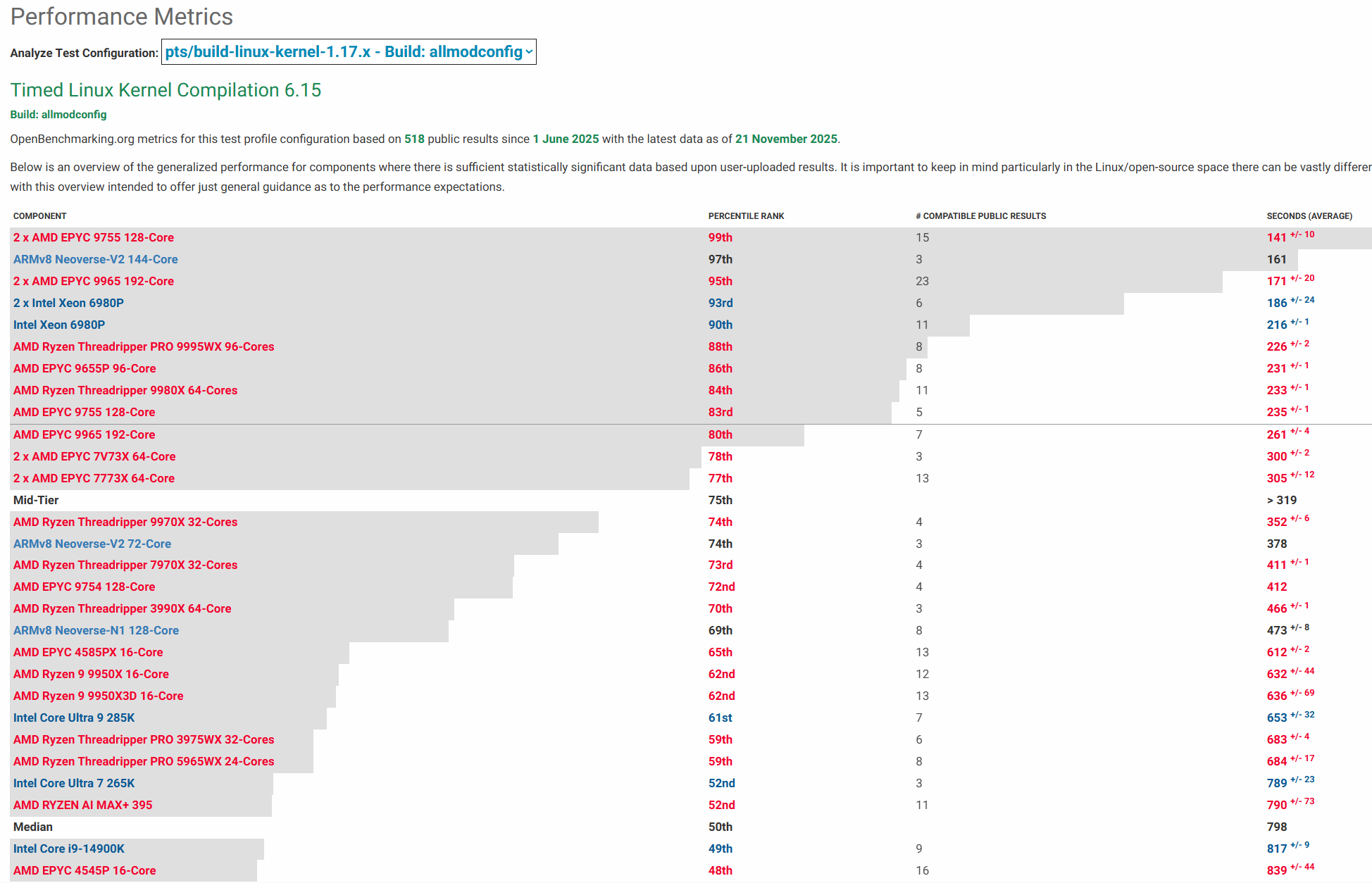 >>7571861 >А в играх проц не важен, первый пик. На твоей табличке разница между 7600 и 14600 меньше, чем между 9800X3D и 14600К. >Я тот самый чел которому важны тесты блендера В блендене не просчитываю, ничего сказать не могу. >и скорости компиляции с++. А в этом могу, так как тогда ты должен сидеть на красных шестнадцатиядерниках. Хотя >Code::Blocks На этом кривом IDE уже ничего серьезного не собирают. >Твоё амд в этом СОСЁТ. Вот последний Timed Linux Kernel Compilation. X3D кеш очень помогает в компиляции больших и жирных проектов.