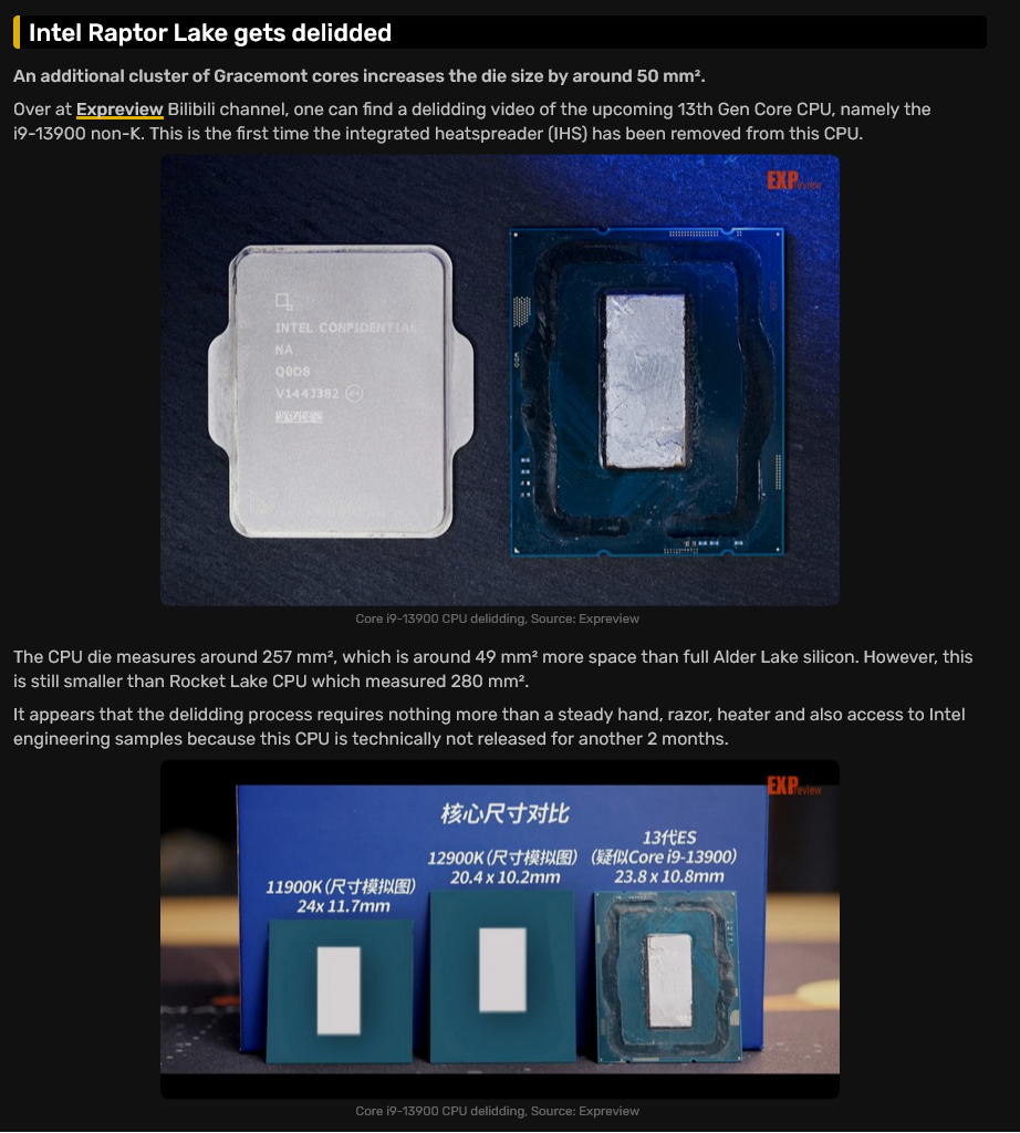 >>7609140 >Это с турбобуст 3.0 5.7 ГГц - это дефолтная частота на все ядра из коробки при условии, что процессору хватает энергии и температуры >И че? Охуеть вот это лимит на литографию, лично инженер интела сказал что задаунскейлить нельзя? Это как бы очень дорого и экономически не выгодно. Никто ничего делать не будет, выпустят как есть, этот проц предназначен только для корпоративного сегмента и нужен будет полтора инвалиду. Его даже рекламить не будут, а продавать втихую, Интелу внутренняя конкуренция со Срультой не нужна, 260К Plus, 275K Plus, 290K Plus сами себя не продадут >У него размеры такие же как и у раптора, один кластер пынеядер то же самое что и одно P-ядро. По сравнению с чиплетным говном, у монолита гигантские размеры >О боже пчел, уже зеоны, метеор лейк рефреш, встройка для пантера и прочее уже есть на нём. Ты рофлишь чтоли? Всё что ты перечислил - это чиплетное говно. Почему АМУДА еще в Ryzen 3000 перешла на чиплеты - их можно миллиардами клепать, там низкий уровень брака. Размеры кристалла Раптора - 257 мм2 (У 12P версии даже чуть больше будет) Размеры CPU-кристалла Эрроу - 117 мм2 Разница в уровне брака - астрономическая А весь брак включается в цену товара.