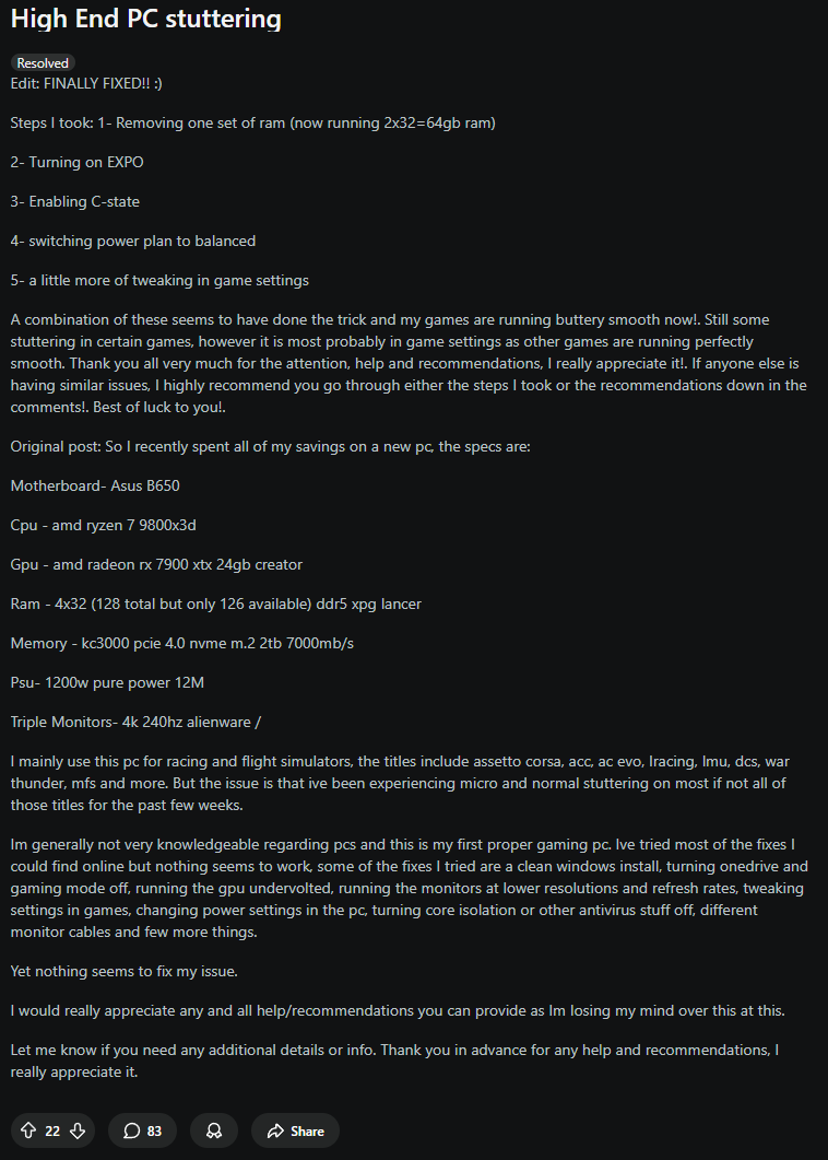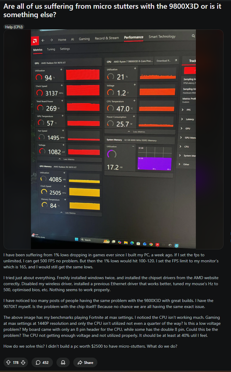 >>7609343 Похоже да. Меня в райзенах чиплеты смущают, хотя и в новых интелах они есть. просто гуглил и слишком много тредов на реддите с жалобами на сттатеры, в основном 7800 и 9800 3д канеш но и на 7700 9700 жалобы есть.