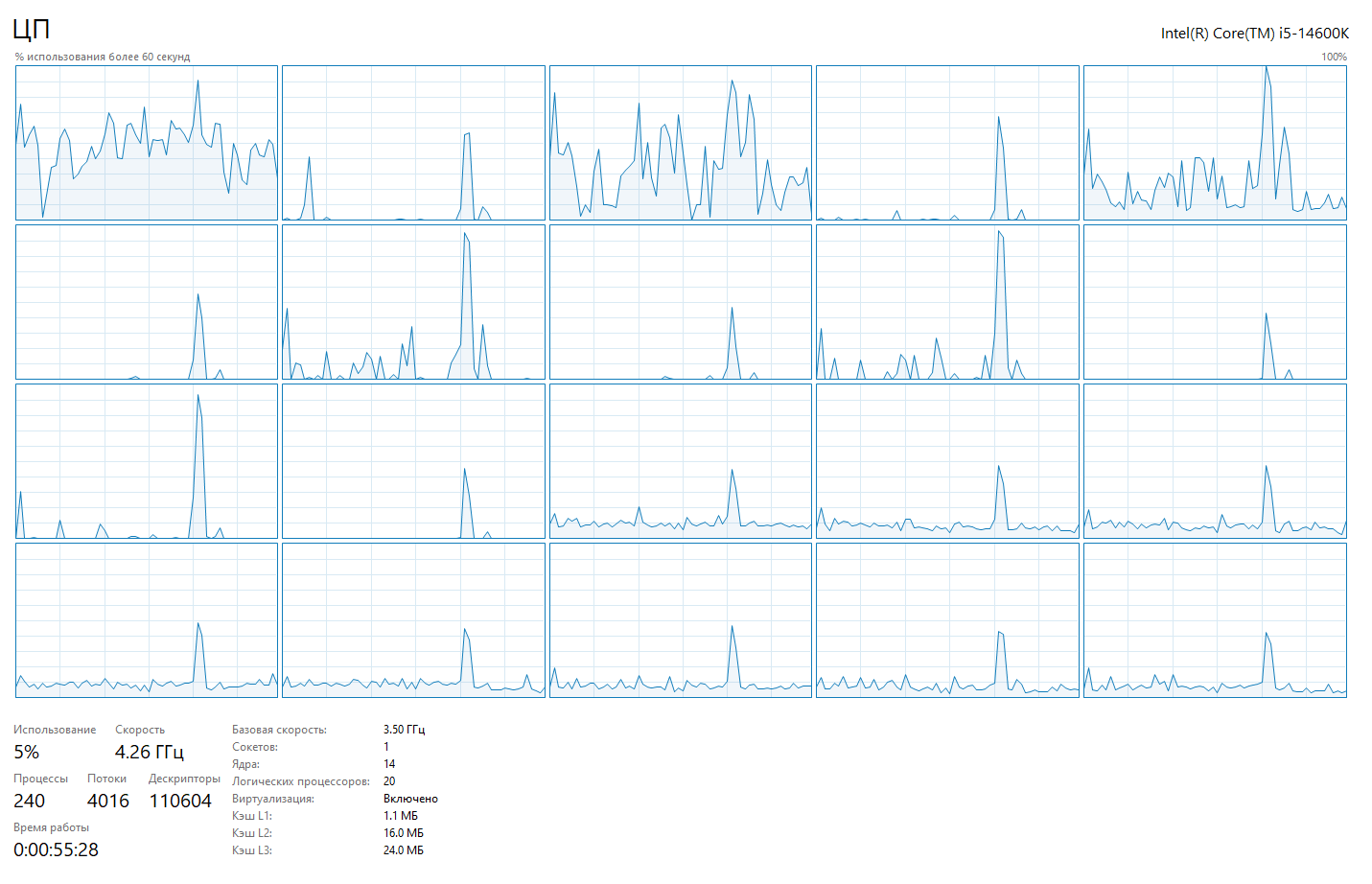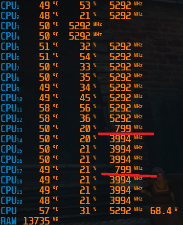 >>7627474 1) Все ок - у тебя E-ядра (с 13 по 20 по мониторингу) загружены на 20%, им нахуй полная частота не нужна. 2) Смотри в инете тесты 13600/14600 к/кф со своей видяхой в курваке и сравнивай.