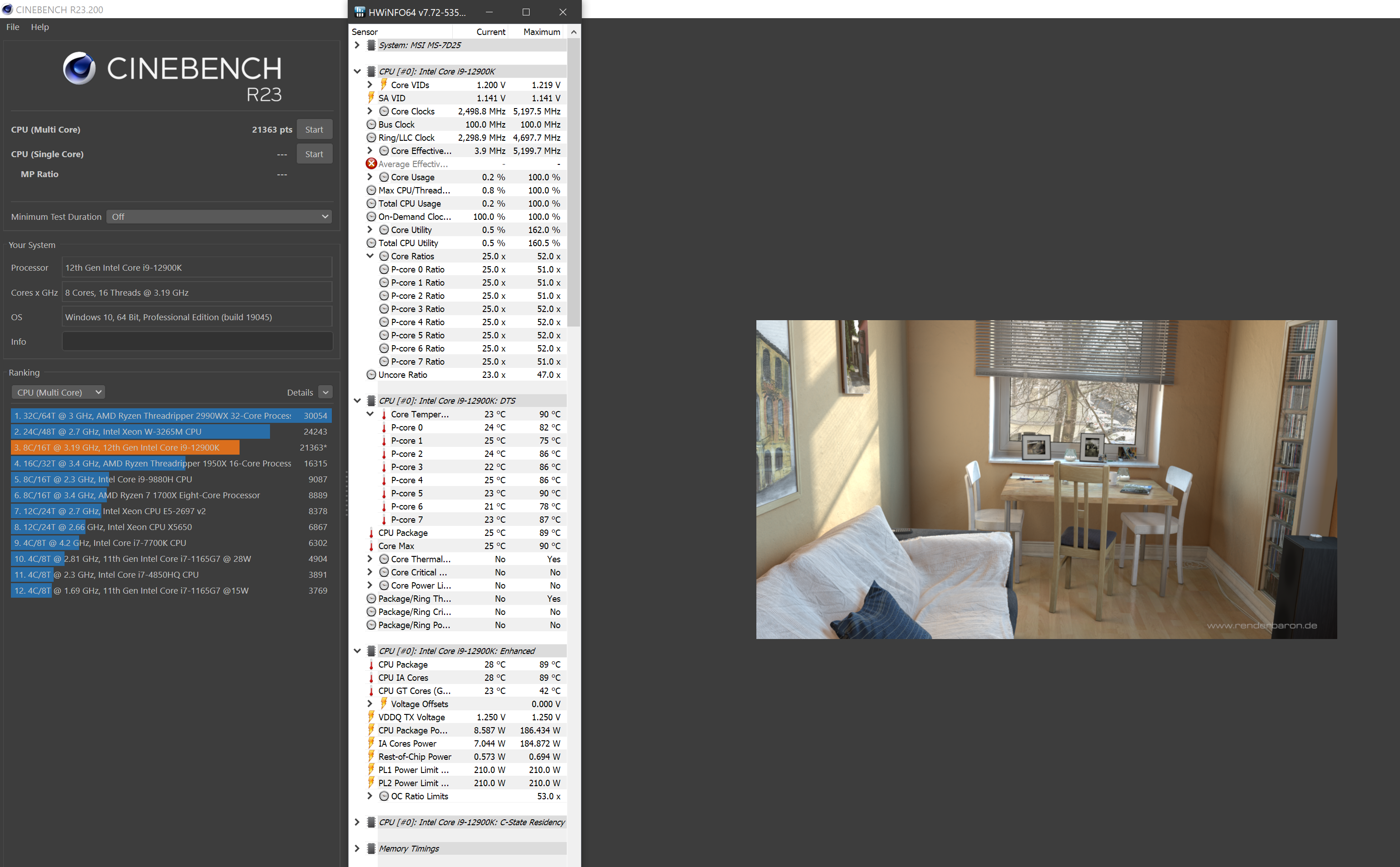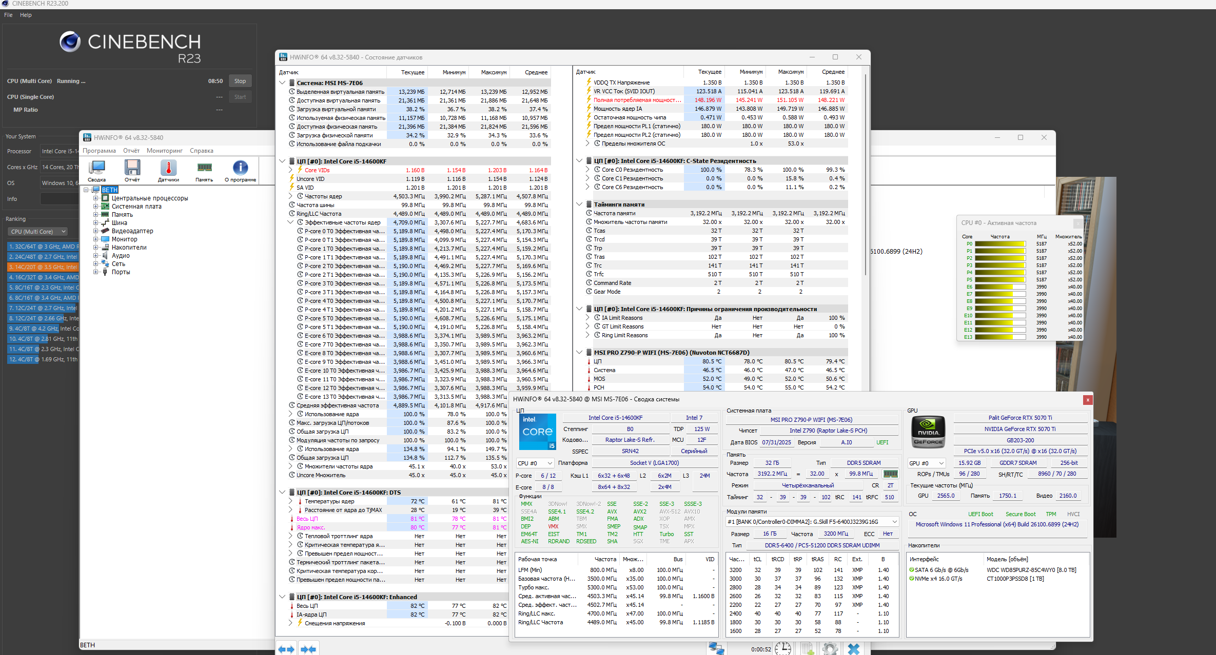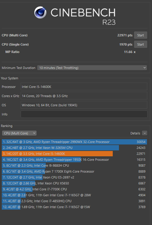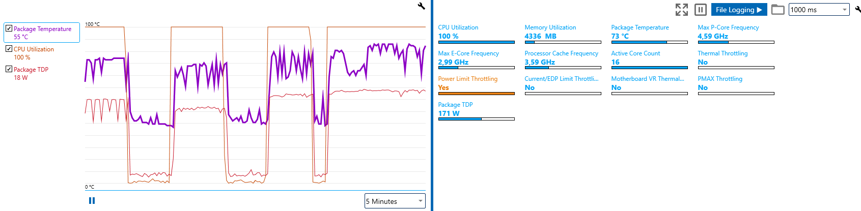 В синьке23 выбиваю 24000+ баллов, температуры 70-74, напруга Vcore в тесте 1.14, жор в тесте 140-145 Вт, частоты 5100/3900 и не дропаются Разгона проца нет - только жесткий андервольт, но я ебантуый с маленьким miniITX копрусом поэтому прошу понять и простить.