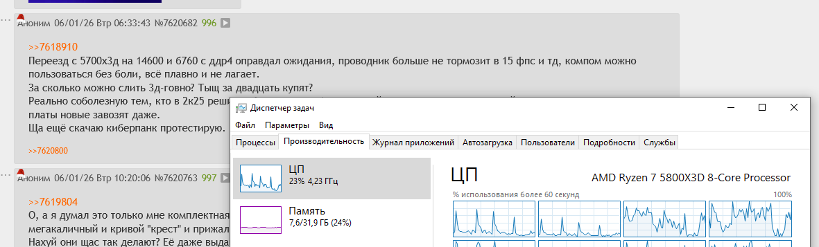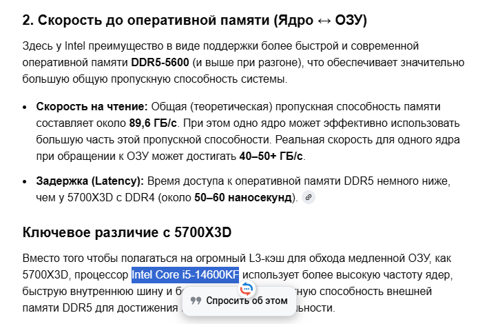 Ребят, самое интересное только впереди - это сравнение 14600кф в киберговне с оверпрайс-калом 5700х3д, который не тянет даже винду без лагов. Зарешает ли швитой 3д-кэш? В течение недели постараюсь выложить, чтобы поставить точку в окончательном решении ам4-вопроса в 2к25.