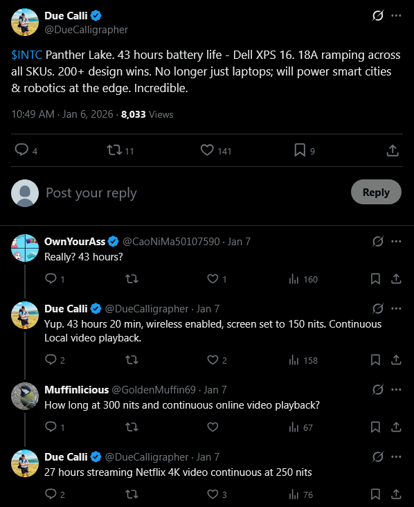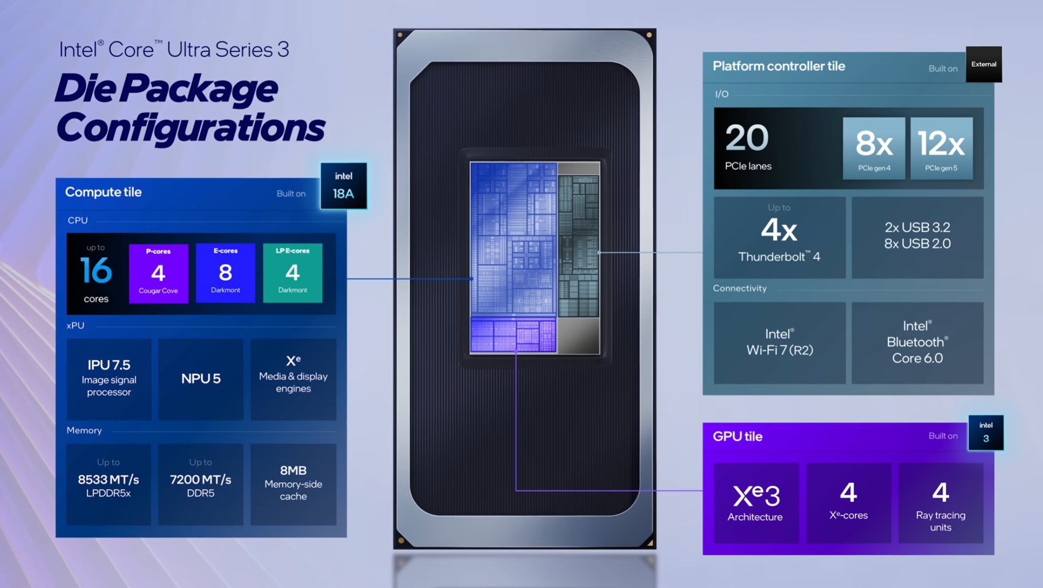 >>7627296 >Графический тайл с 4-мя Xe3 ядрами на техпроцессе Intel3 У самых жирных вариантов Пантеры тайл графики с 12-ю Xe3 ядрами на TSMC сделан Еще в Wildcat Lake графика Xe3 на Intel 18A