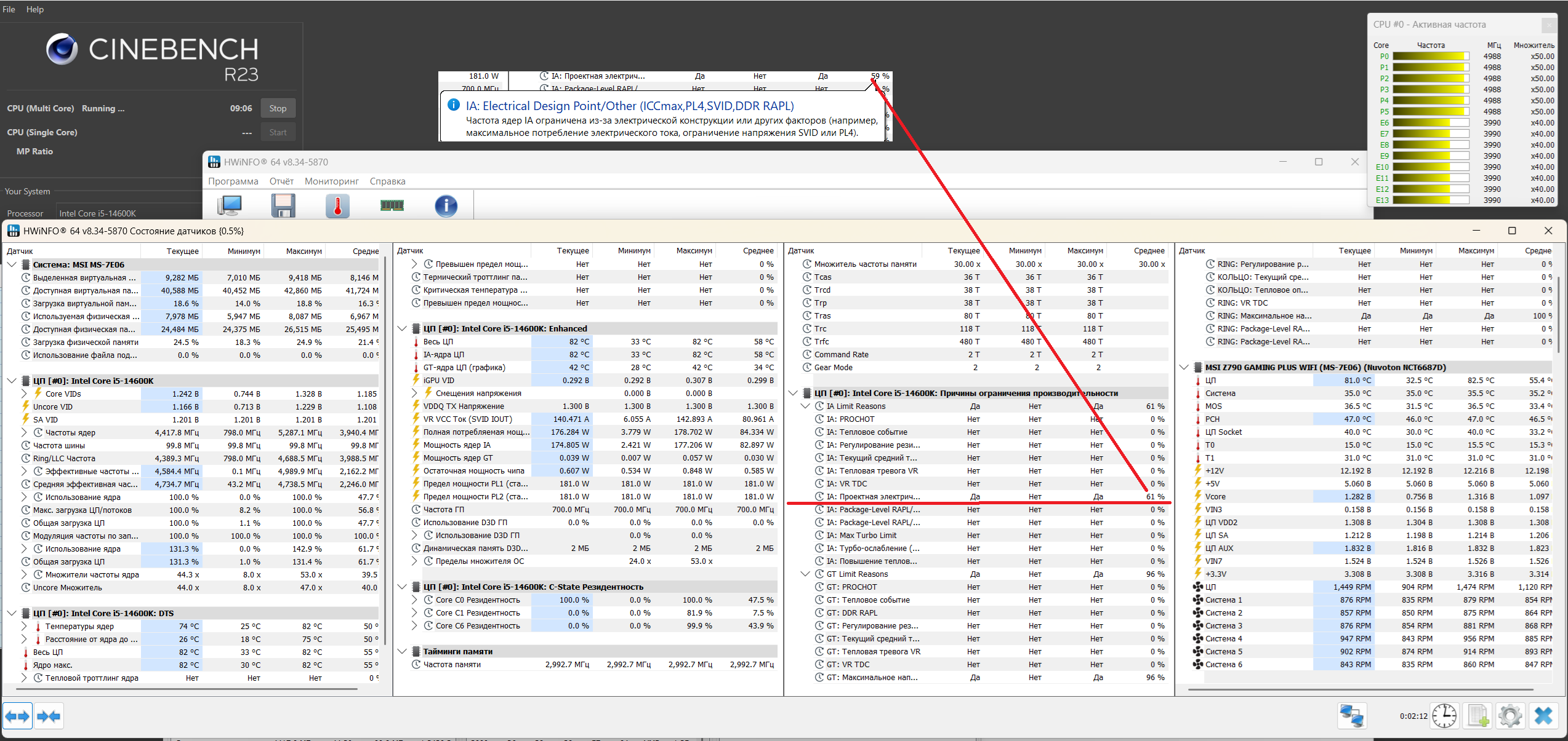 При разгоне до частот 14600каеф 5300/4000 при лимите в 200A в синьке23 сбрасывает частоты до 5000/4000. Подняв лимит тока до 300А тест проходится без дропа частот на 5300/4000