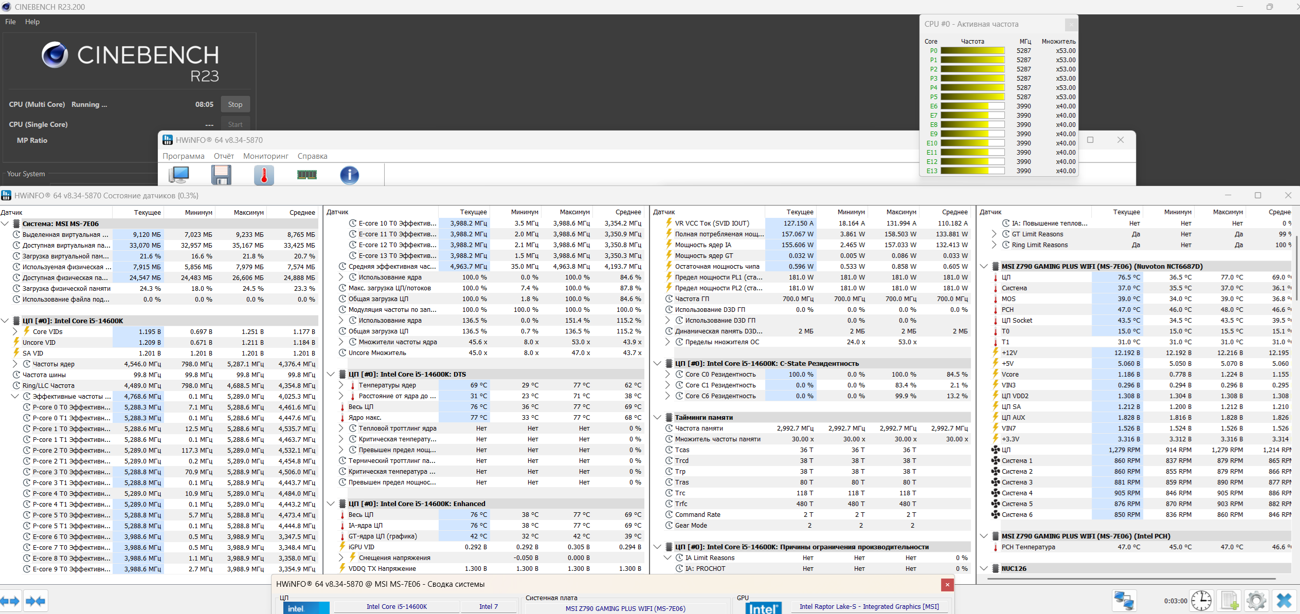 Хоть один в треде есть с 13600k/14600k у которого при 200А (Cpu Current Limit в биосе MSI) держит 5.3 ггц на крупных и 4ггц на мелких ядрах? Вот анон затестил на 200А и у него упал множитель >>7625499 У этого анона >>7626978 280А стоит + лимит потребления повышенный когда матплата и оф спецификация интела>>7627022 рекомендуют 200А ток и не более, вообще 175А у меня дроп частот происходит на 200А