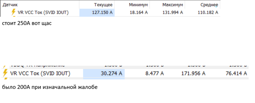 >Проц от недостатка напруги сбрасывает частоту >LLC докидывает под нагрузкой напругу не давая процу сбросить частоту. у меня сбрасывалась частота в сибенче сразу при нажатии кнопки старт, но при выставлении 250а они держится, сейчас 220а выставил (работает только при отключенном интел cep и выключенном undervolt protection)