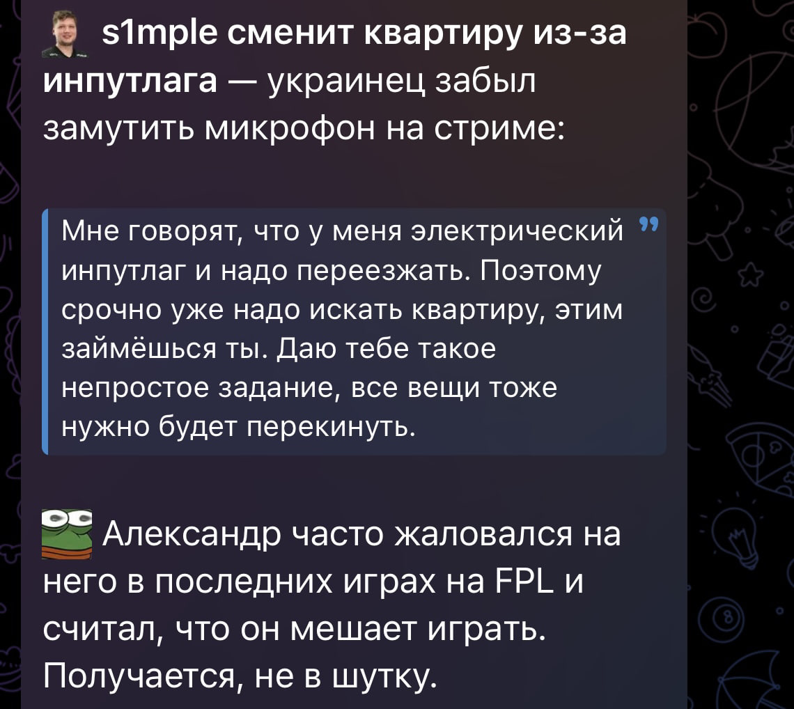 Когда пофиксят инпут лаг хотя я понимаю шо вряд ли, ОПЯТЬ ЖЕ, ВСЕМ ПОХУЙ НА ЭТУ ГЛОБАЛЬНЕЙШУЮ ПРОБЛЕМУ, тогда я скачаю ещё раз кс. Знаю, всё выше сказанное я написал как шизик, прям пиздец, правда? Но всё это полная истина и переубедить меня в этом, это надо быть долбаёбом. Очень жаль, шо мне пришлось по факту удалить эту игру, так как я не терпила ебучая что бы играть её в таком состоянии, у меня реально было в планах попиздится з Сашей. Потому что я уже ходячий мем шо я sin_s1mpla. Анлаки короче, я теперь просто наблюдаю за миром и за тем, как бездарные людишки на твиче ak деад инсайдики пытаются стать похожими на своих кумиров (про игроков и т.п.) незная вообще ничего о инпут лаге и дальше деградируют на своём 4+ эло