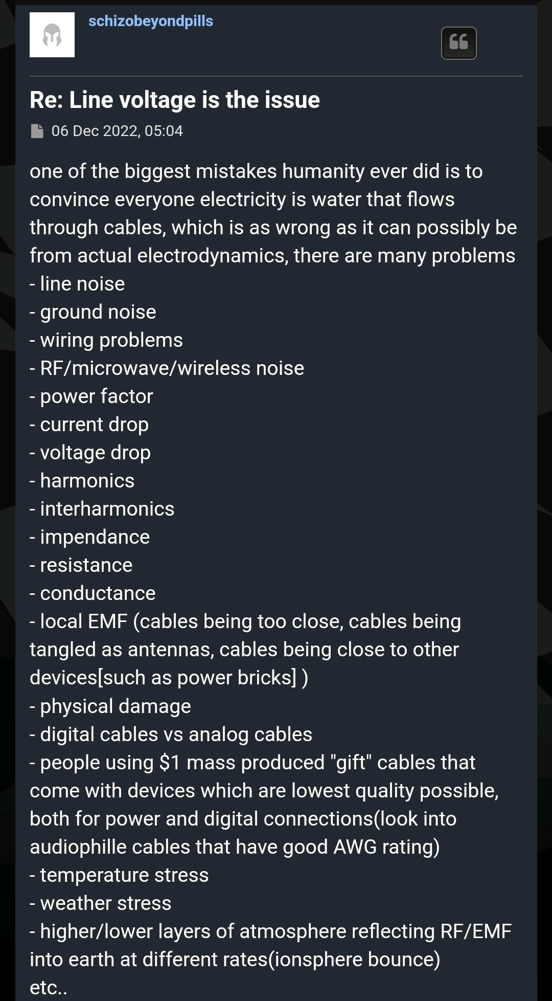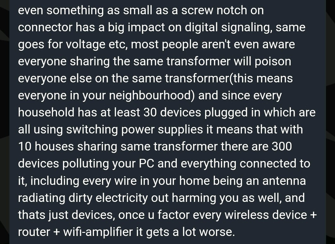 да этих шизов по 5 штук на неделе вылазит, которые "пофиксили", а потом пишут "мням ну это... пук... ну вернулось короче". едиственные фиксы что видел, это кому-то (!) помогли мощные ИБП с ровной синусоидой, или очень большие изъебства с электричеством, щитком, проводкой, энергокомпанией, или же просто переезд еще чудики типа рамы крутят постоянно свои фериты и прочую поебень, и все равно не помогает (кстати он переехал и пропал) то что это электричество/помехи, доказать очень просто - лагает не только компьютер, но и телефон, консоли, любая техника, у меня даже в плохие времена печатать невозможно было на телефоне, вместо "слово" получалось "соьвалд"