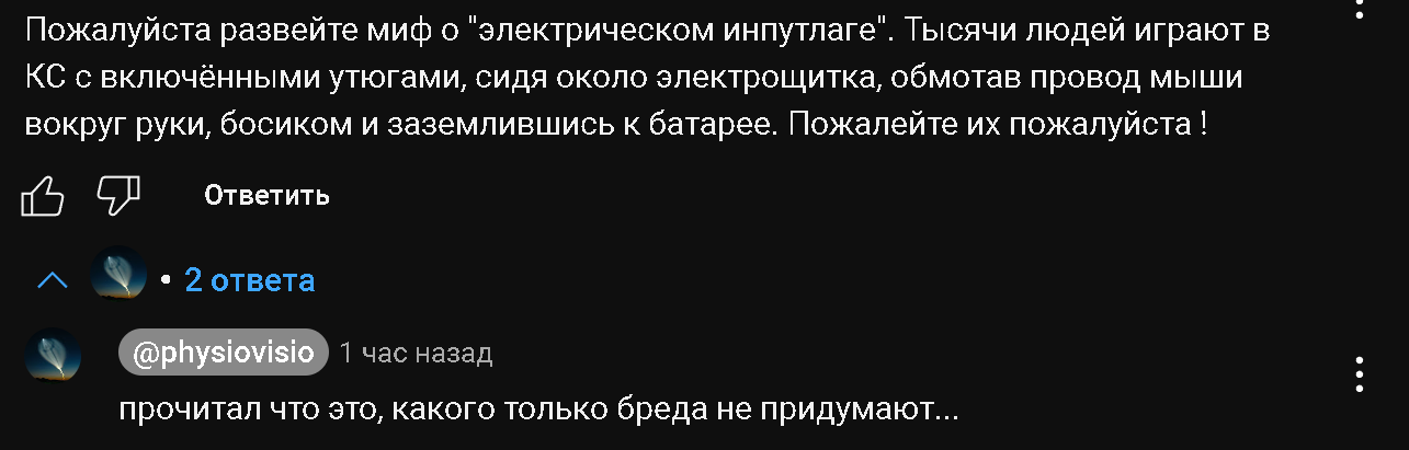 >>6896349 Ебанаты. Я как инженер схемотехник и электрик охуел от хайпа этой хуиты, поскольку это зона моей работы и я как бы бомблю на всякие мифы в этой области. Пробовал кому то на ютубе объяснять, но понял что эти сектанты ЭЛЕКТРИЧЕСКОГО инпут лага конкретно отбитые и все что они могут сказать это что то типа "УУУ ЫЫЫ ТЫ БЫ ВИДЕЛ Я ТО ВИДЕЛ У МИНЯ ЭТО ПОСТОЯННО Я НЕ ПОПАДАЮ В КС ЫЫЫ УУУ" Я не отрицаю реальные задержки, но эти додики киберзадроты кс приплели слово ЭЛЕКТРИЧЕСКИЙ и обвиняют розетку что она дает не тот ток и проч шизу несут. Я просто забил...