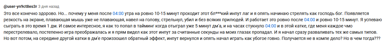 @ezusssss8365 Ну насчёт медленного движения мыши, как на руле - хз. Лично по моим демо и записям игры так не скажешь, что у меня есть задержка, ибо мышкой я так же активно двигаю, однако что-то такое есть и это не мои выдумки. В общем, у меня были e6нyтые клипы моих фликов, сейчас я такое чисто физически сделать не смогу, и дело даже не в том, что я активно не играю уже года 2, а просто мышь движется не так. Это действительно сложно объяснить и даже показать, это та херня, которую надо чувствовать и иметь определенную практику игры с этой проблемой. Допустим, мы немого абстрагируемся от кс, ибо не может быть такого, что этот "инпут лаг" встречается и присутствует только в одной игре. Дак вот, буквально месяца 2 назад решил вспомнить старое, а именно пошёл поиграть в Батлфилд 3. Отлетел на одном старпёрном сервере за хорошую игру, ладно, вдруг у меня в Ютубе вылезли видеоролики людей, которые в этой игре уже не первую тысячу часов сидят и делают нарезки киллов. И как же я тогда охyeл, когда увидел их запись игры, а у них всё регистрировало, и ладно бы я был обмудком, который не может навестись или перестрелять, но нет... причём это даже не у про игроков, а и у обычных подпивасников все нормально. Я тогда спрашивал у них, в чём же секрет, а ответ был один и тот же - никакого секрета нет, вот я тут поставил минималки, тут я может настроил чуток интернет и все, типа забей это все в твоей голове. Нет панацеи от этой проблемы! Я менял роутер, пробовал различные интернет драйвера, настраивал этот интернет в параметрах в винде, менял значение MTU, ограничивал скорость для ПК, использовал TCP Optiizer, ставил другие dns, и все это для того, чтобы убрать джиттер лаг. Судя по тестам он у меня уже минимальный, но ОСНОВНАЯ проблема никуда не исчезла. Меня как сбривали за 1 секунду во всех играх, так и сбривают. Тут либо пан, либо пропал, либо реакция мангуста, либо отлетаешь даже от подпивасника. Мне как требовалось в этой батле иногда по пол обоймы всадить, чтобы убить чела в дали, так и осталось. И дай бог это был бы это я криворукий, но нет же, это совсем не так... Я почти постоянно сижу в КД/3 и меня нарекают читером, заставляют писать игру от третьего лица, да если бы у меня не было этой проблемы, то они бы мой хуй у себя через монитор ощутили. Естественно в тройке сервера с частотой импульса 10 герц, и когда на сервере в одном месте 64 человека постоянно стреляют и накидывают гранаты, то регистрация не будет такой, какой она должна быть, но ведь такая проблема у меня есть и при малом количестве игроков. Тут стоит подметить, что эта проблема непостоянна, то есть она появляется периодически, но довольно часто. Значит так, касательно мышки, я не знаю как было с движением мыши в БФ3 до этого всего, я её ещё в детстве на диске покупал, и тогда нас это вообще не волновало, но если мы возьмём всеми любимую нами игру - кс, то тут я с полной уверенностью могу сказать, что "инпут лаг" есть. В основном, наша с вами проблема в том, что у нас нет чёткой доказательной базы этой проблемы, поэтому мы с вами походим на каких-то сумасшедших фанатиков. Действительно, определённая трудность в демонстрации этого "инпут лага" присутствует. Я придумал один способ, который лично мне помогает ощутить этот "инпут лаг", опять же, стоит предусмотреть тот момент, что ежели человек не помнит как было ДО и как стало ПОСЛЕ, то он не сможет адекватно