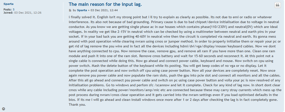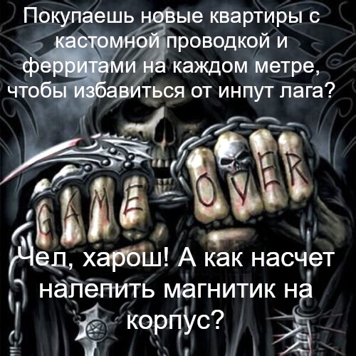 Кстати одна из причин почему у киберзадротов этого нет, потому что у них топовые комплектующие (топ мать, топ бп, топ видеокарта), дорогие районы с качественной проводкой и где все разведено/сделано по нормам. У них поступает чистейший ток в пк и нет даже намека на "инпут лаг".
