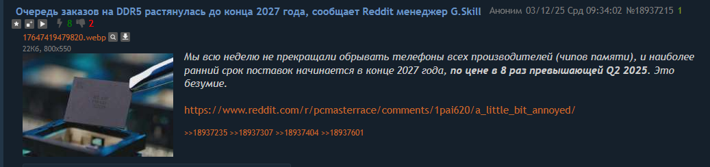 >>7589078 >Сначала они забрали у нас видюхи, потом HDD, теперь ОЗУ Не совсем так. Какая-нибудь норм видюха а-ля 5090 сейчас стоит чет в районе 35k и тянет любое новье очень даже неплохо, среднему анону хватит. С винтами тоже плохо, но не слишком. А вот наборчик ддр4 8 Гб х2 подорожал за 3 месяца где-то с 4k до 12k. В абсолютных цифрах немного вроде, ну 8k к компу за стольник с хуем, но в процентах просто пиздец.