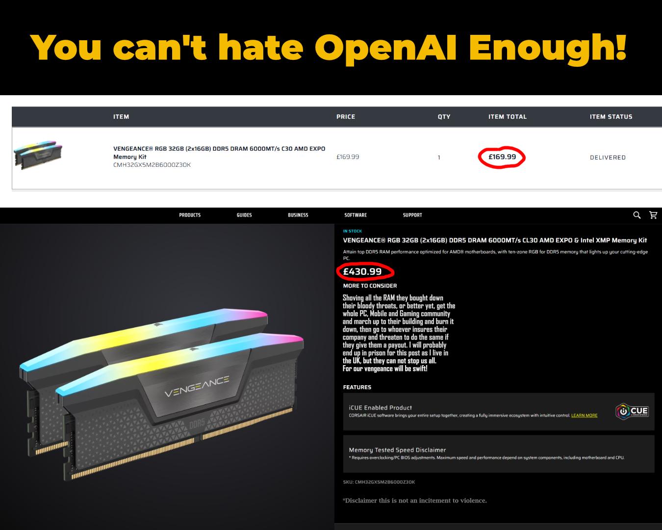 Как будто мало рынку проблем с поставками, так теперь ещё и появляются сообщения, что OpenAI якобы изымает даже обычные потребительские модули DDR5 прямо из домашних ПК геймеров.